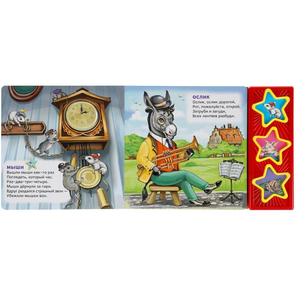 Ребёнок с удовольствием будет листать плотные страницы, рассматривать яркие картинки, читать вместе с родителями интересные стихи, нажимать на кнопки и слушать песенки. Малыш легко освоит включение звука: по нажатию на кнопку песенка включится, при втором нажатии выключится. Благодаря компактному формату книгу удобно взять с собой в дорогу.