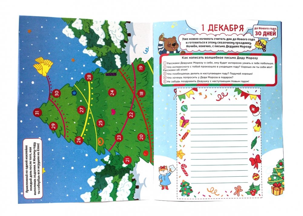 Новогодний адвент-календарь подарит каждому ребёнку настроение наступающего праздника. В нём собраны игры, увлекательные задания, ребусы, поделки на каждый день до наступления Нового года. С ними ждать праздника — гораздо веселее и интереснее! Внутри адвент-календаря найдутся красочные наклейки в виде ёлочных игрушек и плакат в виде ёлки, которую можно заполнить этими игрушками. Повесьте его на стену и украшайте вместе с ребёнком по мере приближения 31 декабря.