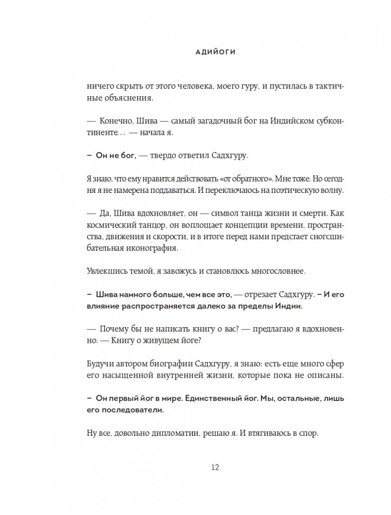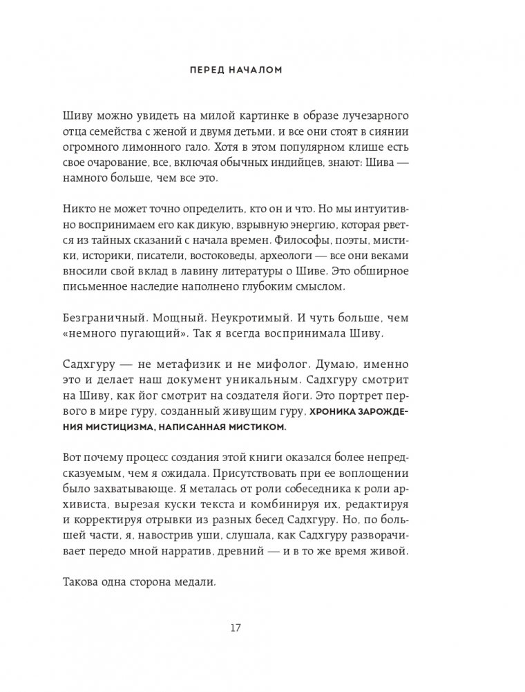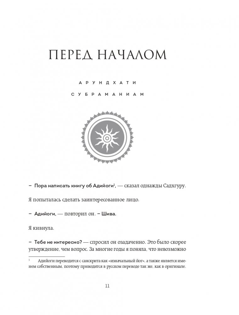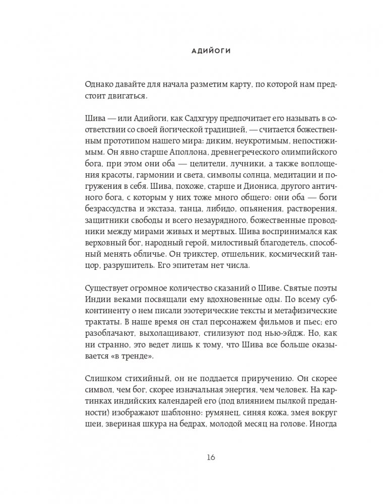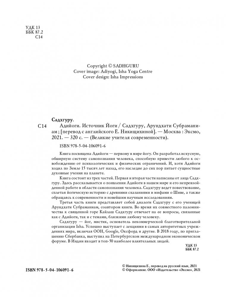 Книга посвящена Адийоги – первому в мире йогу. Он разработал искусную, обширную систему самопознания человека, способную привести любого к освобождению от психологических и физических ограничений. И, хотя Адийоги ходил по Земле 15 тысяч лет назад, его наследие до сих пор питает сущностные духовные учения на планете. Книга состоит из трех частей. Первая и вторая части написаны от лица Садхгуру. Здесь рассказывается о появлении Адийоги в нашем мире и его непревзойденной работе в области самопознания человека. Садхгуру ведет повествование, сплетая йогическую историю с древними сказаниями и мифами о Шиве, а также обращаясь к современности и новейшим научным исследованиям. Третья часть книги представляет собой диалоги Садхгуру с его ученицей Арундхати Субраманиам, соавтором книги. Во время их совместного паломничества к священной горе Кайлаш Садхгуру отвечает на ее вопросы, связанные как с Адийоги, так и с темами, близкими любому человеку. Садхгуру – йог, мистик, основатель некоммерческой благотворительной организации Isha. Успешно выступает с лекциями в самых авторитетных учреждениях мира, включая ООН, Google, Оксфорд и другие. В 2018 году, по приглашению Сбербанка, выступил на Петербургском международном экономическом форуме. В Индии входит в топ-50 наиболее влиятельных людей.