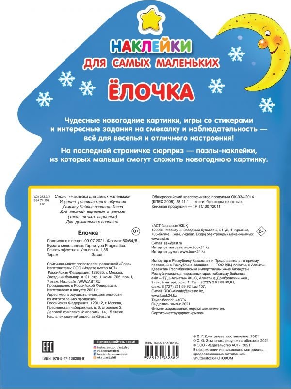 «Ёлочка» — замечательная цветная книжка с фигурной вырубкой в виде новогодней ёлочки. Это красочные иллюстрации + развивающие задания + коллекция новогодних стикеров. На страницах книжки малыши встретятся с лесными зверятами, всех ждут новогодние приключения! А на последней странице бонус — пазлы-наклейки, из которых малыш сложит картинку.