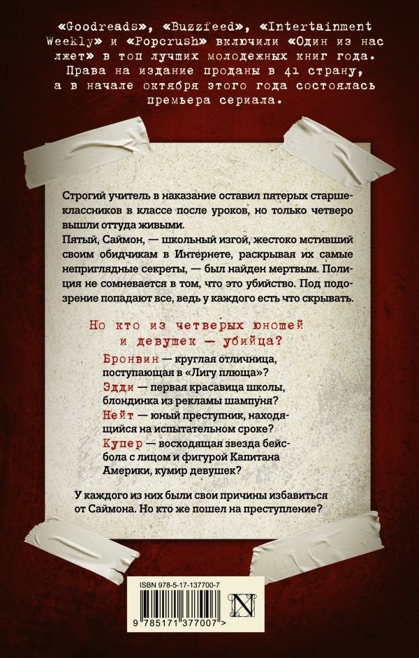 Пятый, Саймон, — школьный изгой, жестоко мстивший своим обидчикам в Интернете, раскрывая их самые неприглядные секреты, — был найден мертвым. Полиция не сомневается в том, что это убийство. Под подозрение попадают все, ведь у каждого есть что скрывать.
