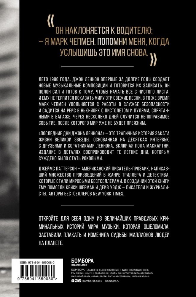 Лето 1980 года. Джон Леннон впервые за долгие годы создает новые музыкальные композиции и готовится их записать. Он полон сил и готов к тому, чтобы начать все с чистого листа, и ему не терпится показать миру эти свежие песни. В то же время Марк Чепмен увольняется с работы в службе безопасности и садится на рейс в Нью-Йорк с пистолетом и пулями, спрятанными в багаже. Через несколько дней случится непоправимое событие, после которого мир уже не будет прежним. "Последние дни Джона Леннона" – это трагичная история заката жизни великой звезды, рассказанная Джеймсом Паттерсоном, американским писателем в жанре триллера и детектива. Он провел десятки интервью с друзьями и соратниками Леннона, включая Пола Маккартни, чтобы оставаться как можно более беспристрастным и честным в роли автора этой книги. Издание в деталях воспроизводит те летние дни, которым суждено было стать роковыми. Дни, когда столкнулись две личности – и пять выстрелов изменили ход истории и заставили сердца миллионов людей содрогнуться.
