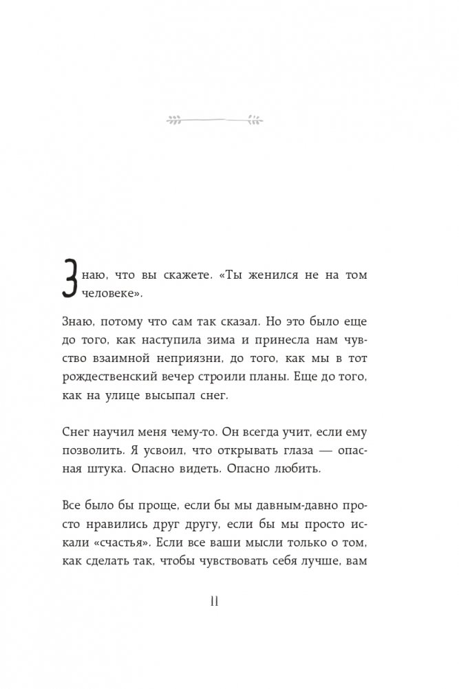 «Пять песен о нас» – романтическая новелла от одного из известнейших экспертов по отношениям Гэри Чепмена, автора легендарного бестселлера «Пять языков любви». Книга подарит вам не только красивую историю о любви, но и несколько уроков по психологии отношений. Марли и Джейкоб поженились в канун Рождества. Теперь, спустя 20 лет, в сочельник они решили развестись. Марли убеждена, что вышла не за того мужчину, Джейкоб устал от того, что его контролируют. Они спят в разных комнатах и, кажется, больше не готовы спасать свой брак. Их отношения покрыты снегом и льдом, как дорога, по которой они зимним вечером спешат к юристу — для того, чтобы поставить точку. Раз и навсегда. Пытаясь срезать путь, они попадают в снежный занос. Марли приходит в себя и, замерзшая, пытаясь отыскать своего мужа, находит дом. Здесь, в теплом и гостеприимном месте она столкнется с призраками прошлого, настоящего и потенциального будущего их брака — с тем, как их выбор влиял и еще может повлиять на судьбу их семьи. Это Рождество преподнесет им неожиданный подарок и поможет ответить на вопрос: они ли судьба друг друга или для того, чтобы счастье вернулось, близкого человека нужно отпустить? ОТЗЫВ: «Иногда резкий занос или падение необходимы для того, чтобы понять: не всегда мы можем получить ту любовь, которую жаждем. Особенно если не будем готовы идти на компромисс и "проживать" отношения, по-настоящему, день за днем. "Пять песен о нас" — это ода тем, кто отказывается сдаваться ради настоящей любви. Отличный микс магии и надежды». — Eva.ru