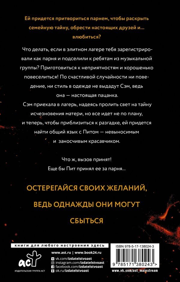 Сэм приехала в лагерь, надеясь пролить свет на тайну исчезновения матери, но все идет не по плану, и теперь, чтобы приблизиться к разгадке, ей придется найти общий язык с Питом — невыносимым и заносчивым красавчиком. Что ж, вызов принят! Еще бы Пит принял ее за парня...