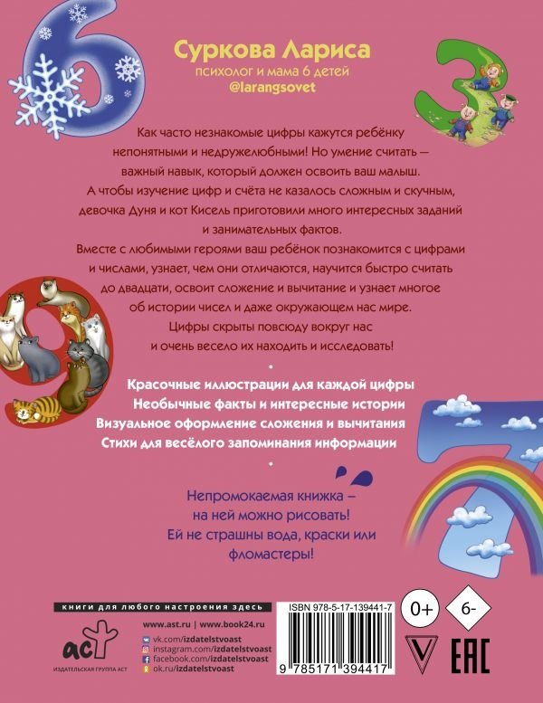 Как часто незнакомые цифры кажутся ребёнку непонятными и недружелюбными! Но умение считать - важный навык, который должен освоить ваш малыш. А чтобы изучение цифр и счёта не казалось сложным и скучным, девочка Дуня и кот Кисель приготовили много интересных заданий и занимательных фактов.