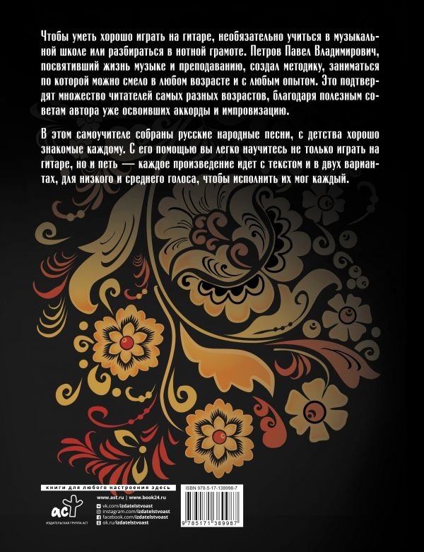 Чтобы уметь хорошо играть на гитаре, необязательно учиться в музыкальной школе или разбираться в нотной грамоте. Петров Павел Владимирович, посвятивший жизнь музыке и преподаванию, создал методику, заниматься по которой можно смело в любом возрасте и с любым опытом. Это подтвердят множество читателей самых разных возрастов, благодаря полезным советам автора уже освоивших аккорды и импровизацию. В этом самоучителе собраны русские народные песни, с детства хорошо знакомые каждому. С его помощью вы легко научитесь не только играть на гитаре, но и петь — каждое произведение идет с текстом и в двух вариантах, для низкого и среднего голоса, чтобы исполнить их мог каждый.