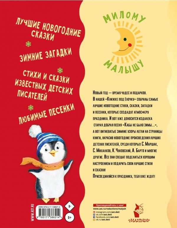 На Новый год принято дарить подарки. Один из самых полезных подарков — книга. Именно с неё начинается большое путешествие в удивительный мир литературы. Отличным проводником в этот волшебный мир станет "Книжка под ёлочку" — именно на её страницах начинаются чудеса. Лучшие детские писатели — В. Сутеев, С. Маршак, К. Чуковский и другие — подготовили для юного читателя зимние произведения, которые подарят новогоднее настроение и ощущение праздника.