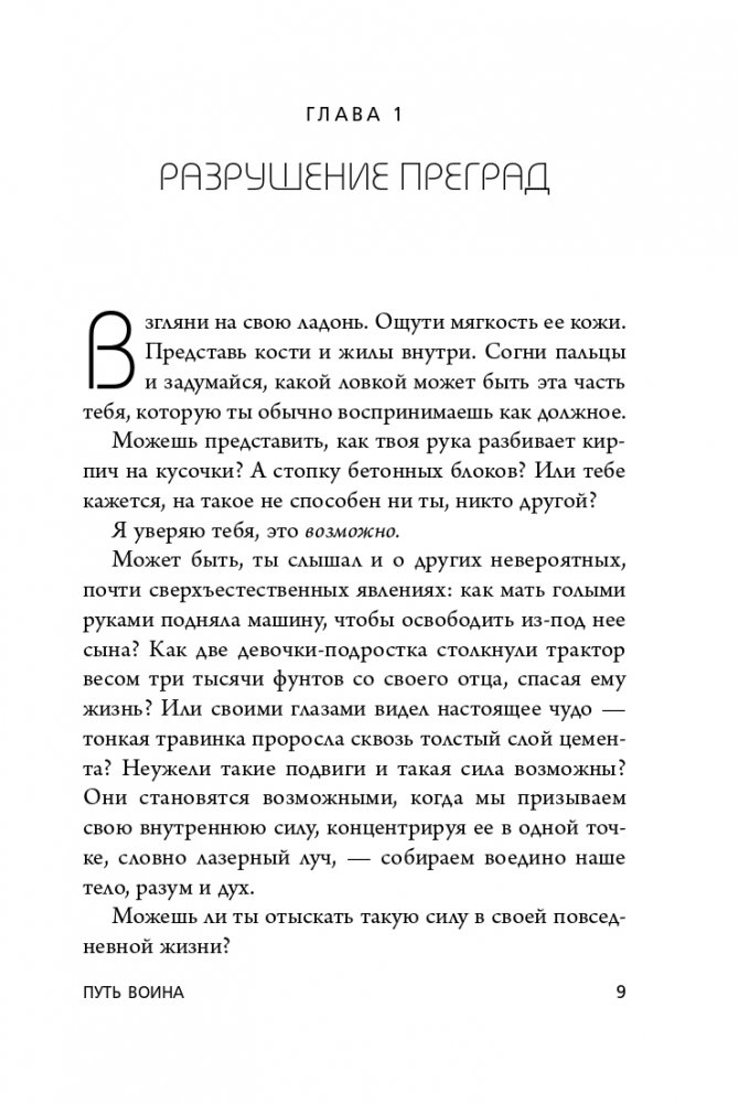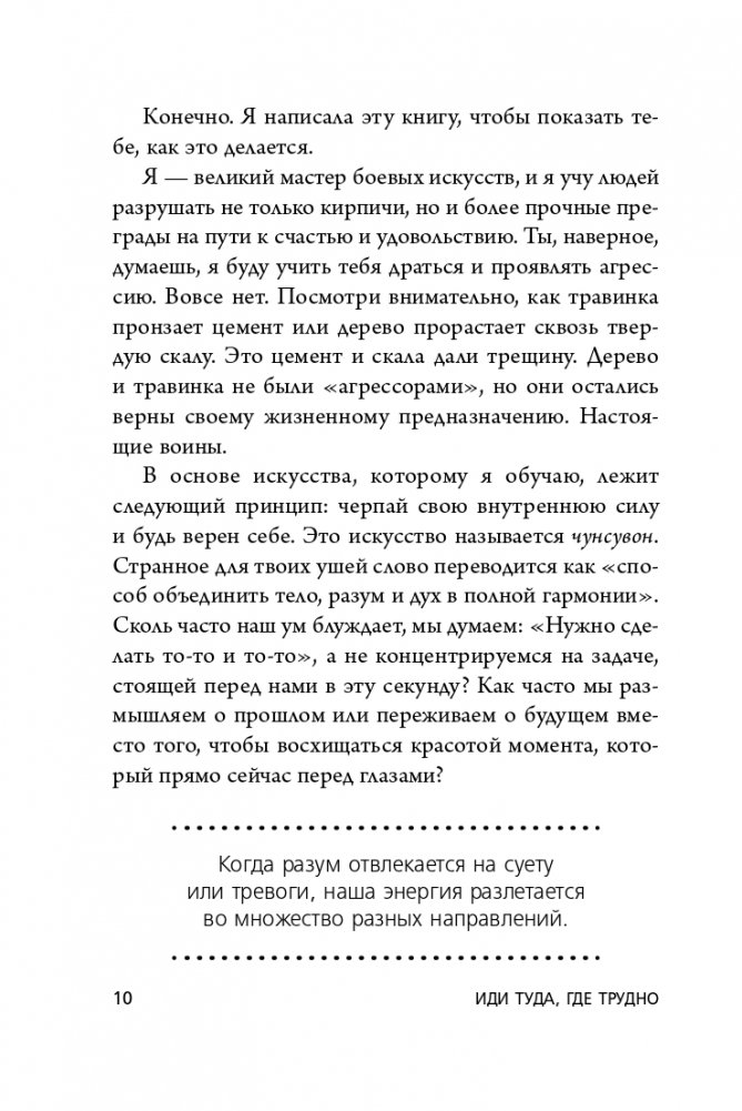 Когда разум захламлён суетой, тревогой и плохими мыслями — наша энергия рассеивается. Это происходит снова и снова, и мы становимся слабыми и неэффективными. Более того, в такой ситуации мы не можем быть честными с собой. Цель искусства Чунсувон — дать практические инструменты, благодаря которым вы сможете освободиться от ограничивающих, пагубных состояний ума, взглянуть на себя с разных сторон и пробудить свой невероятный потенциал к созданию жизни. Цитаты «ХРАНИ ВЕРНОСТЬ СВОИМ ЦЕЛЯМ, ОСОБЕННО КОГДА ВСЕ КАЖЕТСЯ БЕЗНАДЕЖНЫМ». «МЫ МОЖЕМ МНОГОМУ НАУЧИТЬСЯ У ПРИРОДЫ, ВНИМАТЕЛЬНО НАБЛЮДАЯ ЗА ЕЕ КРАСОТОЙ И СИЛОЙ». «НАМ ТАК ЧАСТО ХОЧЕТСЯ СДАТЬСЯ ВСЕГО В ОДНОМ ШАГЕ ДО УСПЕХА. НО ЕСЛИ УПОРНО И НАСТОЙЧИВО ТРУДИТЬСЯ, ДВЕРИ ОТКРОЮТСЯ». «НАСТОЯЩИЙ ПУТЬ ВОИНА — ГОРАЗДО БОЛЬШЕ, ЧЕМ ПОБЕДА НА СОРЕВНОВАНИИ». «ЕСЛИ БУДЕШЬ СРАВНИВАТЬ СЕБЯ С ДРУГИМИ, ТЫ УПУСТИШЬ ВОЗМОЖНОСТЬ НАЙТИ И РАЗВИТЬ СВОИ ЛУЧШИЕ КАЧЕСТВА И СИЛЬНЫЕ СТОРОНЫ». Об авторе Доктор Тэюн Ким — великий мастер боевых искусств, писательница и мотивационный спикер. Она начала тренироваться в возрасте семи лет, нарушив тысячелетнюю традицию, запрещавшую девочкам в Южной Корее изучать боевые искусства. Несмотря ни на что, Тэюн Ким стала первым мастером боевых искусств в Корее и одной из величайших мастеров боевых искусств в мире. В качестве главного тренера она привела первую в истории американскую женскую команду по тхэквондо к золотой медали на международных играх в Сеуле и помогла проложить путь женщинам на соревнования по боевым искусствам в рамках Олимпийских игр. Доктор Ким основала собственную школу боевых искусств, нацеленную на преодоление препятствий во всех сферах жизни. Преподает в своей академии в заливе Сан-Франциско. Также основала и возглавила ведущую технологическую компанию в Кремниевой долине и получила множество наград за выдающиеся достижения в гуманитарной сфере. Отзыв «Эта книга попала мне в руки в нужное время. Она стала маленьким пособием, как проще взглянуть на то, что мы усложняем ежедневно. Хочется, чтобы каждый смог впустить в свою жизнь принципы Чунсувон». — Валерия Баринова, редактор раздела Lifestyle на портале «Чемпионат»