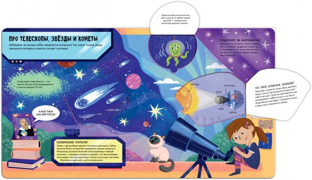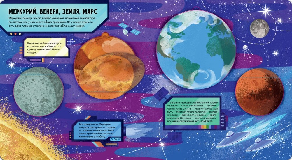 Интерактивная книжка с окошками «Далекий космос» познакомит маленьких почемучек с тем, как устроена Вселенная, с планетами Солнечной системы, с Луной, звездами и созвездиями, кометами и астероидами, с телескопами, ракетами и спутниками.