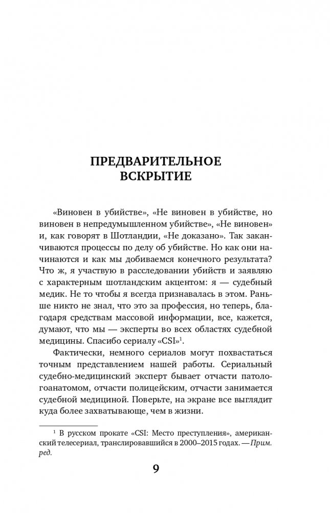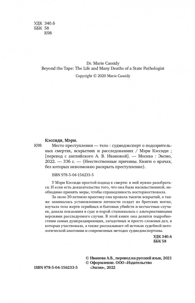 У Мэри Кэссиди простой подход к смерти: в ней нужно разобраться. И если есть доказательства того, что она была насильственной, необходимо принять меры, чтобы справедливость восторжествовала. За свою 30-летнюю практику она провела тысячи вскрытий, а также занималась установлением личности солдат из братских могил, изучала тела жертв серийных и бытовых убийств и несчастных случаев, давала показания в суде и порой сталкивалась с альтернативными версиями расследуемого случая. В этой книге она делится подробностями самых душераздирающих, загадочных и просто сложных дел, в которых участвовала, а также рассказывает об истоках судебной паталогической анатомии и современных методах судмедэкспертизы.