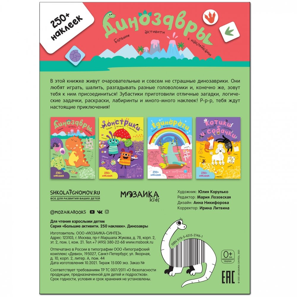 Книга «Динозавры» из серии «Большие активити. 250 наклеек» — настоящая находка! Тут есть все, что так обожают дети. Много-много наклеек: больше 250. Самые любимые герои — динозавры. И конечно, веселые развивающие задания. Стоит бросить вызов себе самому и найти выход из запутанного лабиринта, разгадать судоку, поломать голову над логическими задачками и поискать самые неожиданные отличия между картинками. Динозавры ответственно заявляют: скучно не будет! А еще такие занятия способствуют развитию логики, мышления, внимания, мелкой моторики, речи.