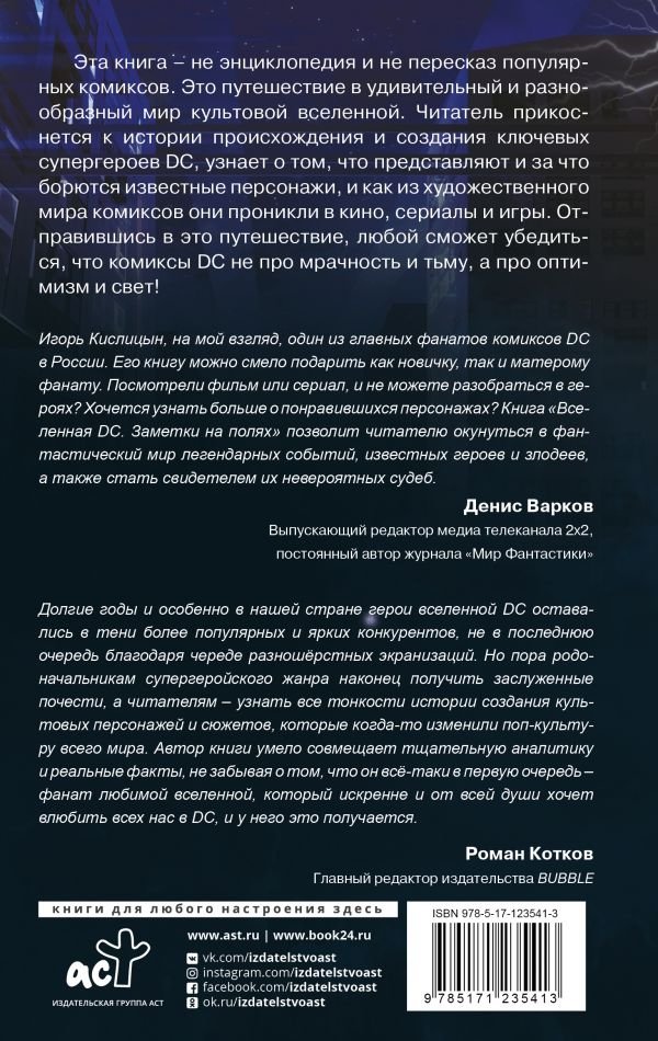 Эта книга – не энциклопедия и не пересказ популярных комиксов. Это путешествие в удивительный и разнообразный мир культовой вселенной. Читатель прикоснется к истории происхождения и создания ключевых супергероев DC, узнает о том, что представляют и за что борются известные персонажи, и как из художественного мира комиксов они проникли в кино, сериалы и игры. Отправившись в это путешествие, любой сможет убедиться, что комиксы DC не про мрачность и тьму, а про оптимизм и свет!