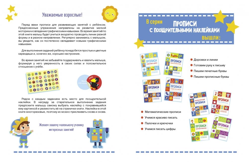 Не секрет, что хвалить ребёнка очень важно. Ведь тем самым вы поддерживаете у него интерес к учёбе и уверенность в своих силах. В этих прописях за правильное и аккуратное выполнение заданий вашего маленького ученика ждут призы - поощрительные наклейки. Ребёнок сам может выбрать понравившуюся ему наклейку и разместить её рядом с выполненным заданием.