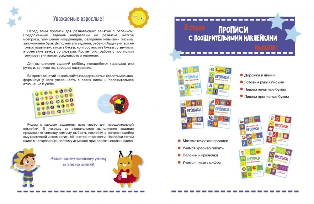 Не секрет, что хвалить ребёнка очень важно. Ведь тем самым вы поддерживаете у него интерес к учёбе и уверенность в своих силах. В этих прописях за правильное и аккуратное выполнение заданий вашего маленького ученика ждут призы - поощрительные наклейки. Ребёнок сам может выбрать понравившуюся ему наклейку и разместить её рядом с выполненным заданием.