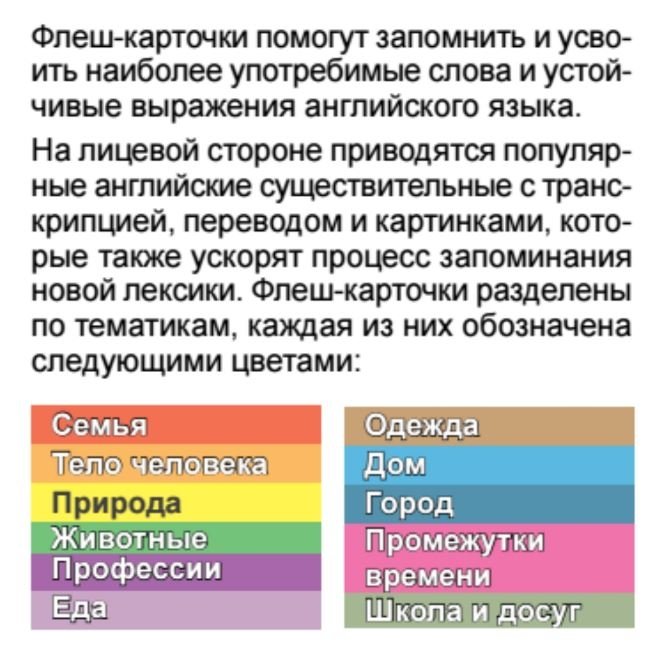 Флеш-карточки помогут запомнить и усвоить популярные слова и устойчивые выражения английского языка. Карточки сопровождаются ассоциативной картинкой, русскоязычной транскрипцией, облегчающей чтение слов, и переводом. Также набор дополнен карточками с наиболее употребимыми прилагательными. Соединяя их с существительными, можно составить еще больше словосочетаний и фраз. Для начинающих изучать английский язык.