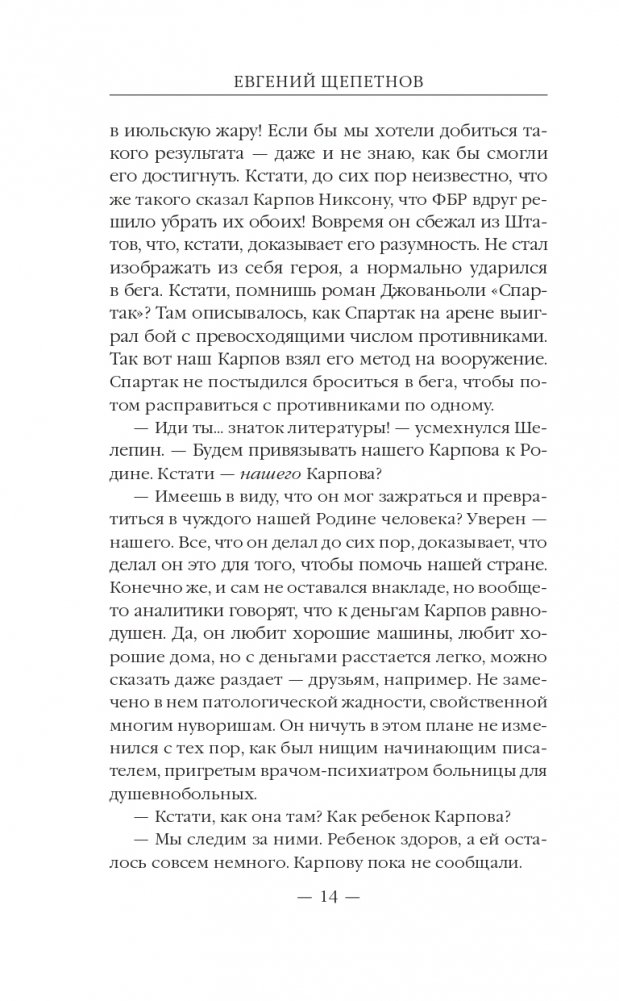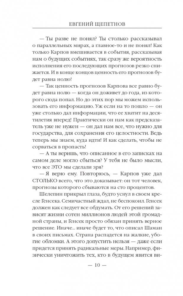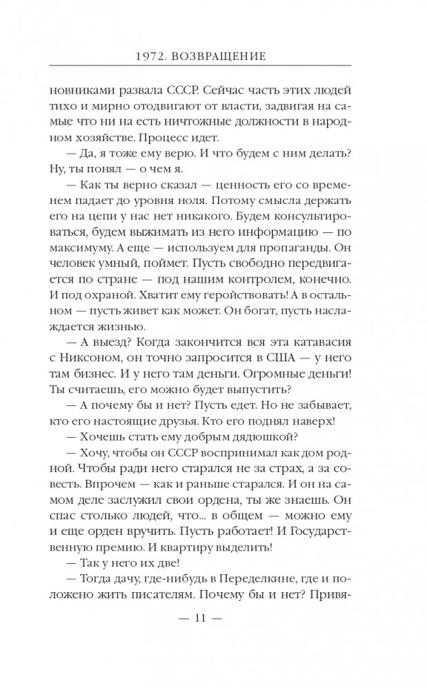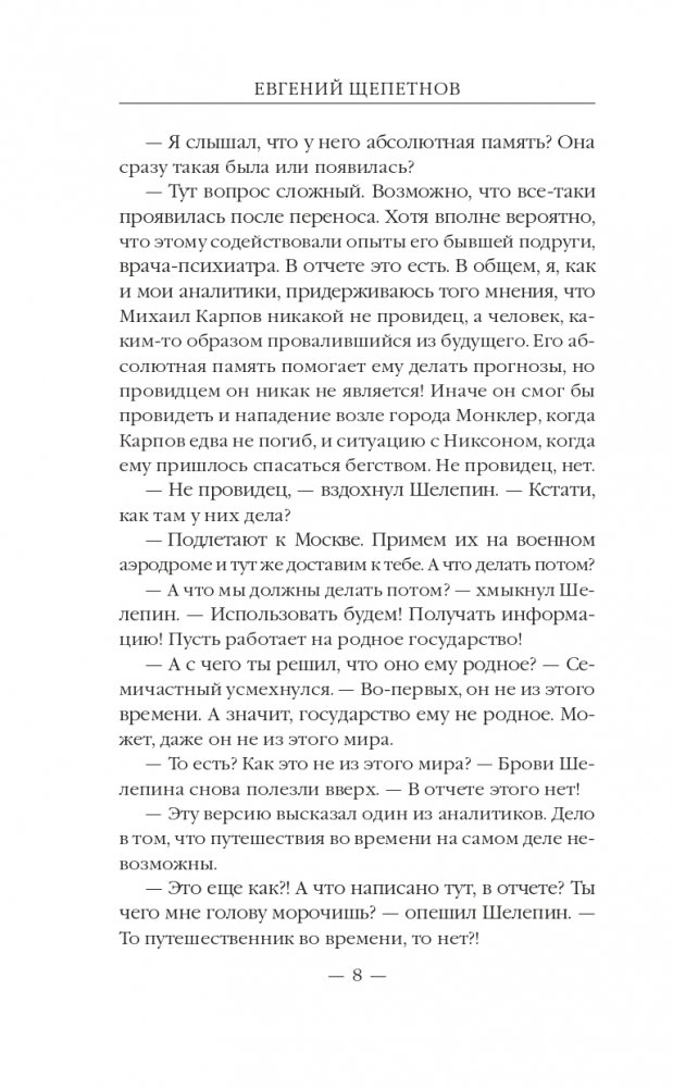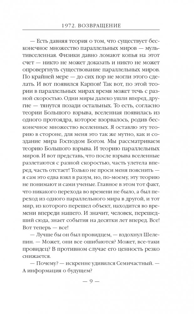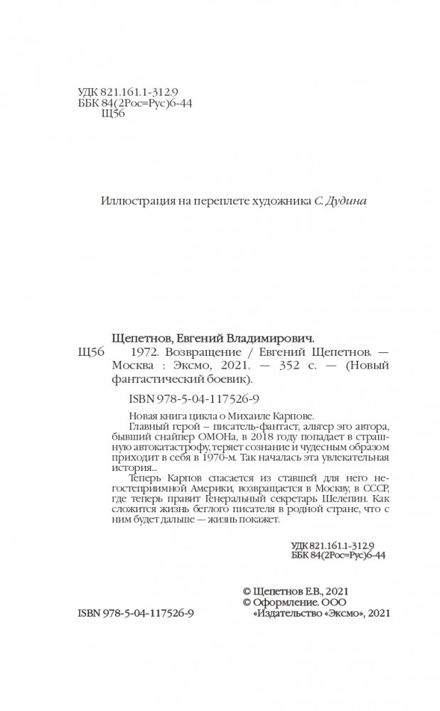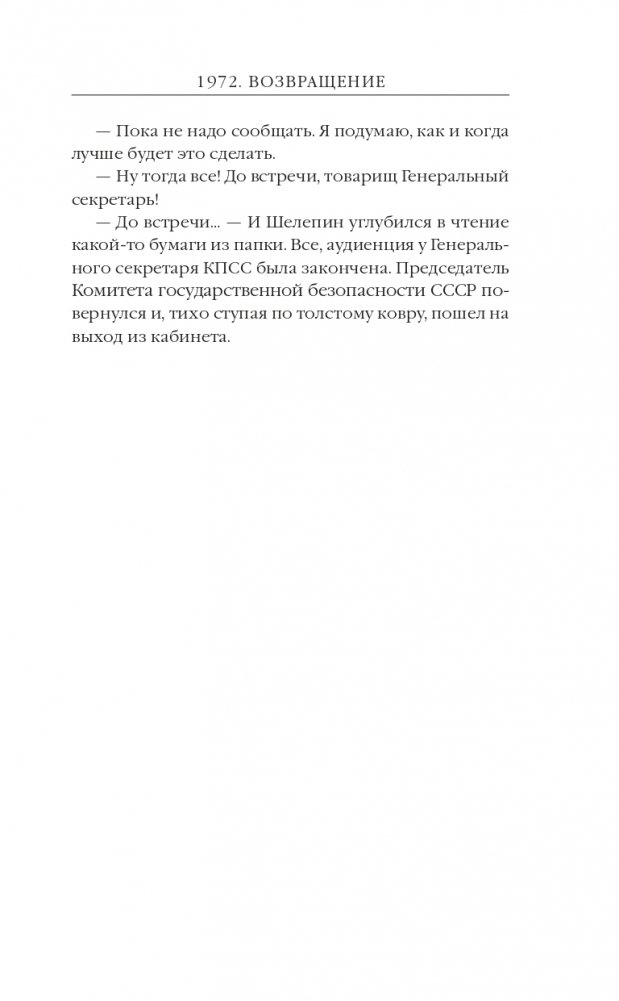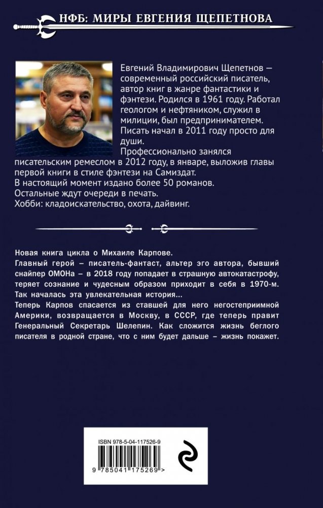 Новая книга цикла о Михаиле Карпове. Главный герой – писатель-фантаст, альтер эго автора, бывший снайпер ОМОНа, в 2018 году попадает в страшную автокатастрофу, теряет сознание и чудесным образом приходит в себя в 1970-м. Так началась эта увлекательная истороия... Теперь Карпов спасается из ставшей для него негостеприимной Америки, возвращается в Москву, в СССР, где теперь правит Генеральный Секретарь Шелепин. Как сложится жизнь беглого писателя в родной стране, что с ним будет дальше - жизнь покажет.