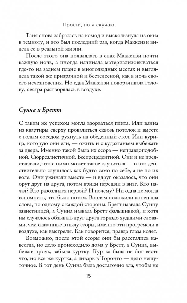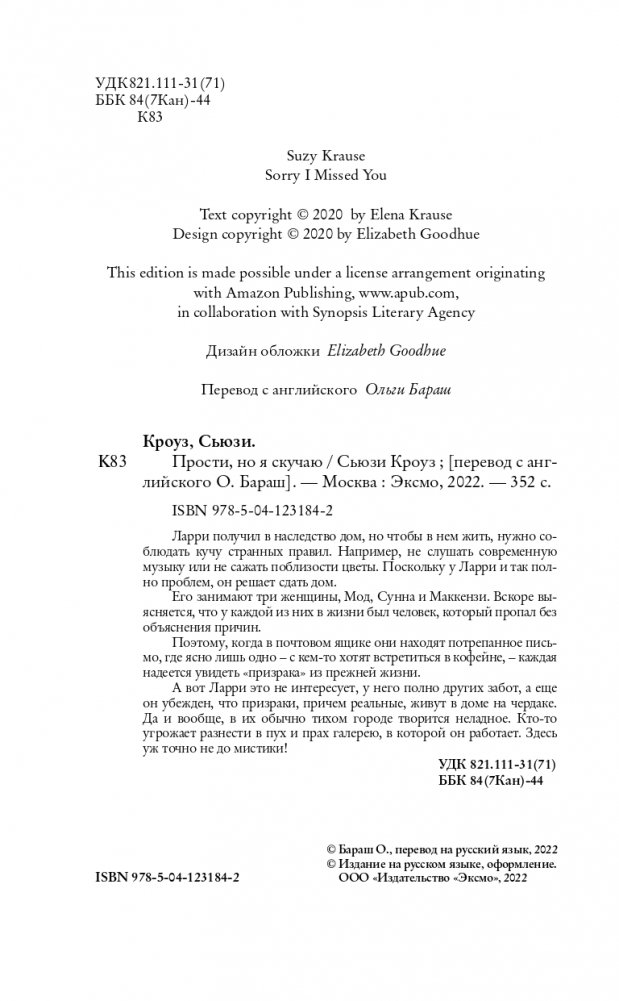 Три женщины. У каждой есть сокровенный вопрос. Одно письмо — в нем все ответы. Кому оно достанется? Ларри получил в наследство особняк, но, чтобы в нем жить, нужно соблюдать кучу странных правил. Например, не слушать современную музыку или не сажать поблизости цветы. Поскольку у Ларри и так полно проблем, он решает сдать дом. Его занимают три женщины, Мод, Сунна и Маккензи. Вскоре выясняется, что у каждой из них в жизни был человек, который пропал без объяснения причин. Поэтому, когда в почтовом ящике они находят потрепанное письмо, где ясно лишь одно – с кем-то хотят встретиться в кофейне, – каждая надеется увидеть «призрака» из прежней жизни. А вот Ларри это не интересует, у него полно других забот, а еще он убежден, что призраки, причем реальные, поселились на чердаке. Да и вообще, в их обычно тихом городе творится неладное. Кто-то угрожает разнести в пух и крах галерею, в которой он работает. Здесь уж точно не до мистики! «Причудливая, оригинальная история о необычной дружбе и силе надежды. "Прости, но я скучаю" — это жемчужина». — Федра Патрик «Энергичная, очень приятная книга о призраках прошлого и о важности дружбы между людьми». — Kirkus Reviews