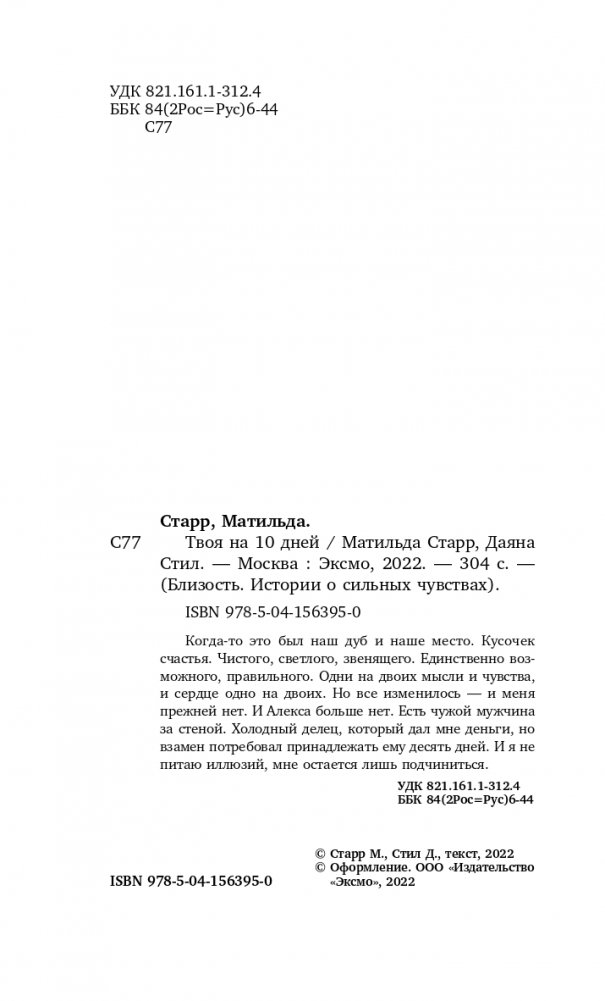— Десять дней, — сказал он тоном, не предполагающим возражений. — И ни минутой меньше. Десять дней ты будешь в полном моем распоряжении. Я могу делать с тобой все, что захочу. А ты должна беспрекословно подчиняться. Никаких других условий не будет. ⠀⠀⠀⠀⠀ 1800 ВЫСОКИХ ОЦЕНОК. 100 ВОСХИЩЕННЫХ ОТЗЫВОВ. ⠀⠀⠀⠀⠀ Когда-то это был наш дуб и наше место. Кусочек счастья. Чистого, светлого, звенящего. Единственно возможного, правильного. Одни на двоих мысли и чувства, и сердце одно на двоих. Но все изменилось — и меня прежней нет. И Алекса больше нет. Есть чужой мужчина за стеной. Холодный делец, который дал мне деньги, но взамен потребовал принадлежать ему десять дней. И я не питаю иллюзий, мне остается лишь подчиниться.