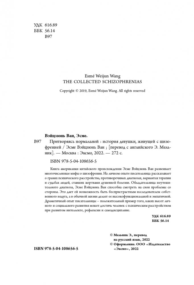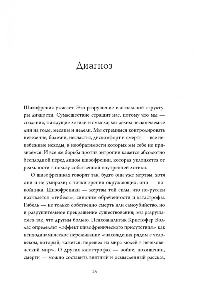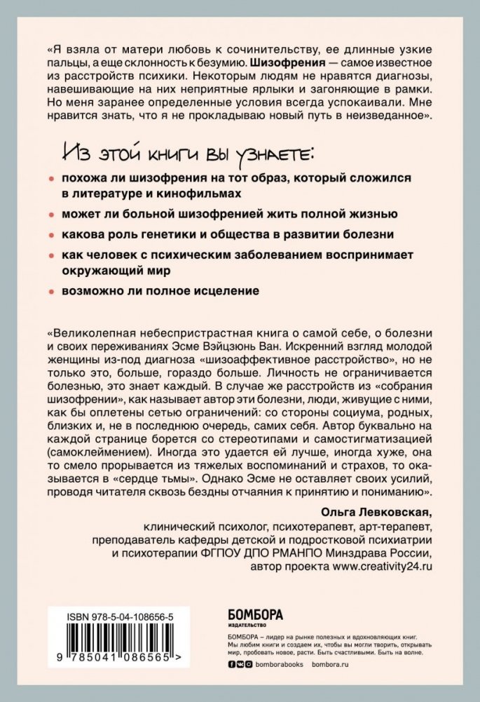 Книга американки китайского происхождения Эсме Вэйцзюнь Ван развеивает многочисленные мифы о шизофрении. На личном опыте писательница рассказывает о гранях психического расстройства, противоречивых диагнозах, вариантах терапии и судьбах людей, ставших жертвами душевной болезни. Обладательница неутешительного диагноза, Эсме Вэйцзюнь Ван способна смотреть на свои проблемы со стороны. Это дает ей возможность быть беспристрастным исследователем собственного недуга, а в обычной жизни делает ее высокофункциональной и эмпатичной. Драматичный опыт писательницы – положительный пример того, каких высот личного и социального развития может достичь человек с психическим расстройством при развитом интеллекте, рефлексии и самодисциплине.