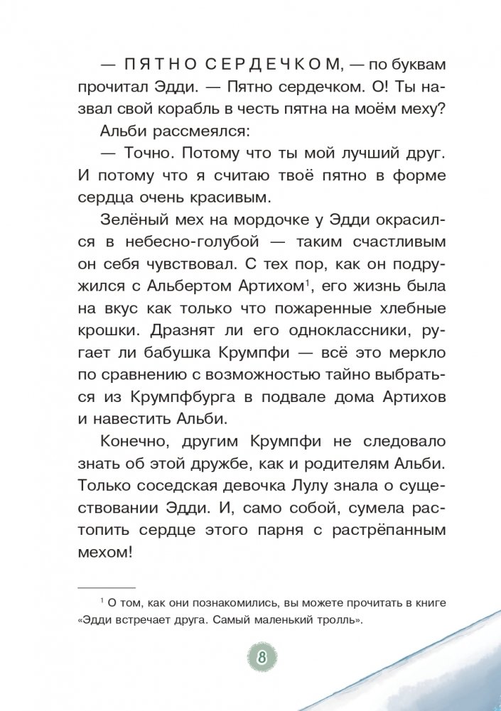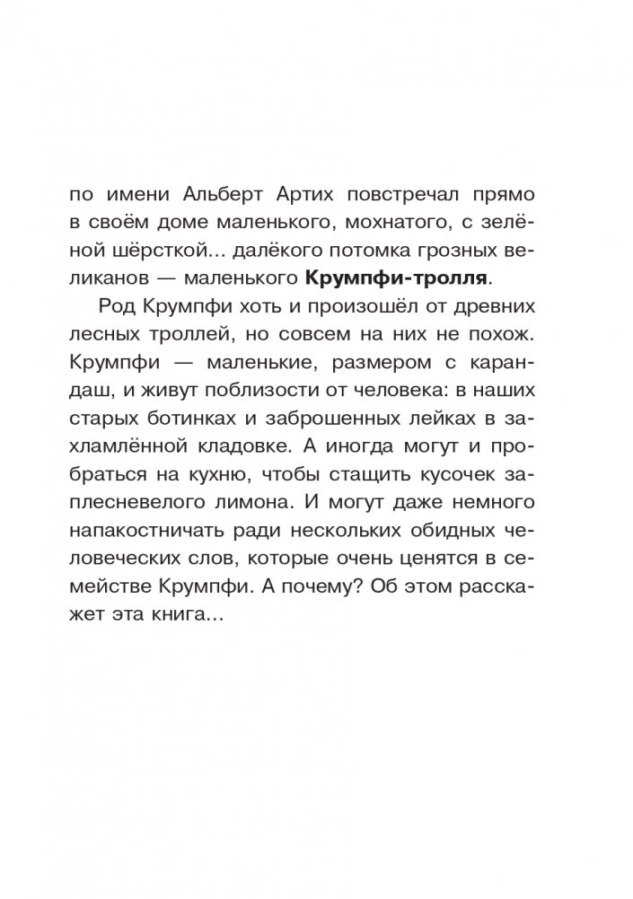 Если вы слышите странные звуки, если всё валится из рук, если вещи оказываются не на своих местах, возможно, в вашем подвале поселилось семейство троллей Крумпфи. Вы любите чай? Тролли его просто обожают. Правда, их чай необычный: он сделан из человеческих обидных слов. Бабушка-тролль тщательно высушивает такие слова, а потом дробит на чаинки. Поэтому тролли радуются, когда кто-то ругается. И если вдруг попадётся доброжелательная семья, они сделают всё, чтобы люди поссорились. И только один маленький тролль с пятнышком в виде сердца не умеет быть злым и вредным. Заваривайте чай, устраивайтесь поудобнее, и давайте знакомиться с троллем Эдди и его друзьями. Тролли обожают воду, а вместо похода в аквапарк скатываются вниз по водосточной трубе. Вот только в это раз всё идёт не по плану. Два маленьких тролля исчезают. Тролль-профессор отправляется на их поиски и не возвращается. А в доме столько опасностей: ловушки для крыс и люди, которым ни в коем случае нельзя показываться. Смелый тролль Эдди решает спасти друзей. Придумала Крумпфи-троллей Аннет Рёдер, известный немецкий автор. На написание историй о троллях Аннет вдохновили её трое детей. А иллюстратор детских книг Барбара Кортуэс подарила героям выразительную внешность. Серия «Приключения Крумпфи-троллей» состоит из 11 книг, в каждой из которых поднимается серьёзная и актуальная тема: от благополучия в семье до буллинга в школе, при этом подача мягкая, приправленная добрыми шутками. Красочные иллюстрации, удобный формат и крупный шрифт помогут детям младшего школьного возраста полюбить чтение.