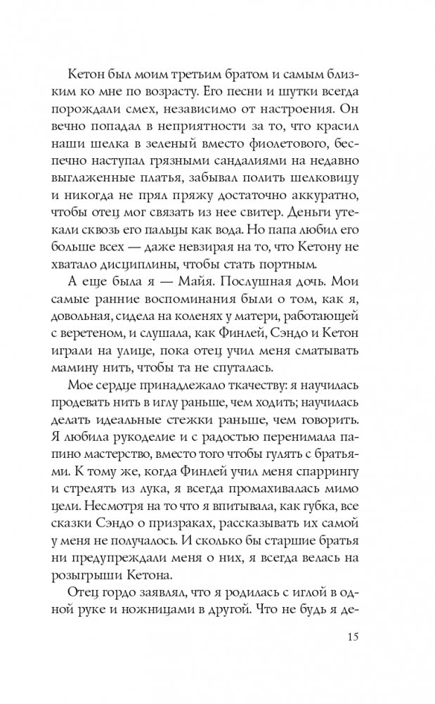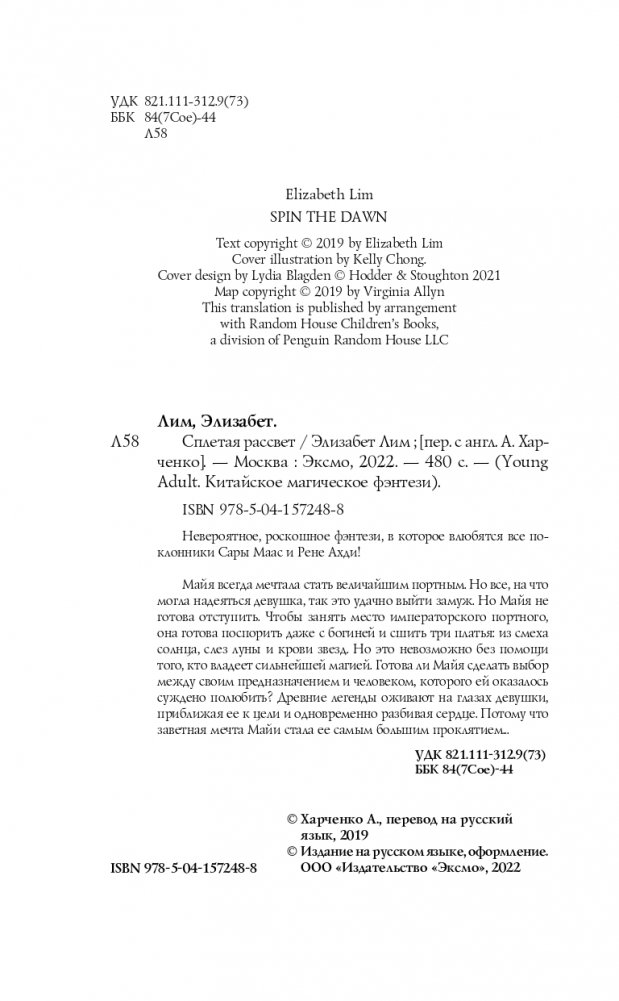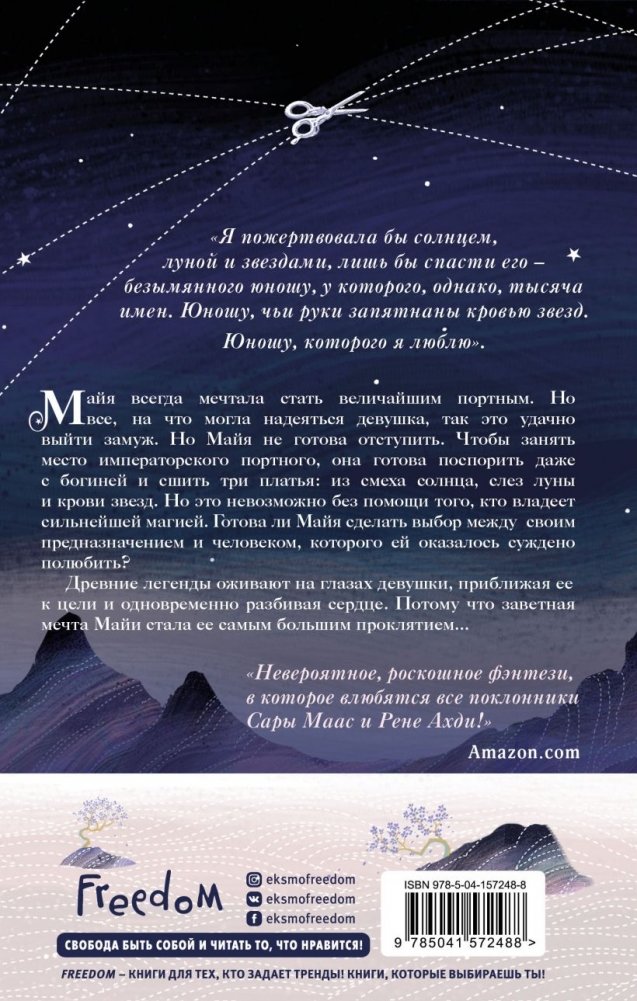 Невероятное, роскошное фэнтези, в которое влюбятся все поклонники Сары Маас и Рене Ахди! Майя всегда мечтала стать величайшим портным. Но все, на что могла надеяться девушка, так это удачно выйти замуж. Но Майя не готова отступить. Чтобы занять место императорского портного, она готова поспорить даже с богиней и сшить три платья: из смеха солнца, слез луны и крови звезд. Но это невозможно без помощи того, кто владеет сильнейшей магией. Готова ли Майя сделать выбор между своим предназначением и человеком, которого ей оказалось суждено полюбить? Древние легенды оживают на глазах девушки, приближая ее к цели и одновременно разбивая сердце. Потому что заветная мечта Майи стала ее самым большим проклятием...