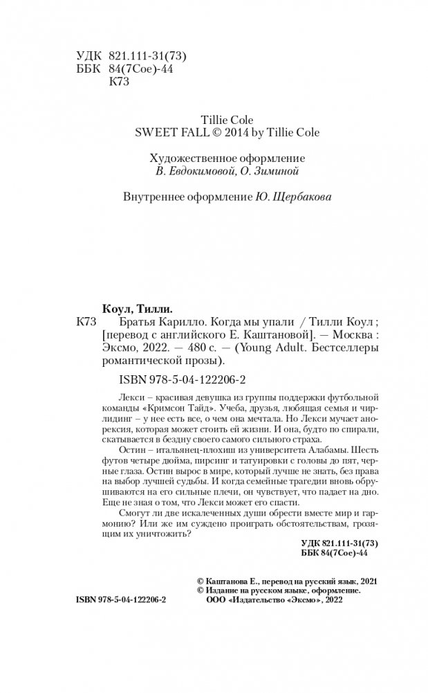 Тилли Коул — автор, чьи строки влюбляют в себя с первых страниц. Ее романы в России были проданы тиражом свыше 102 тыс. экземпляров! Светлые, искренние, трогательные и глубокие книги Коул оставят неизгладимый след в вашем сердце. «Когда мы упали» — это роман-исповедь. Рассказывая историю Лекси, Тилли Коул делится своим уникальным опытом борьбы с анорексией, привычками и переживаниями, которые сопровождают на протяжении этого пути. Анорексия — огромная проблема для многих девушек, которая тесно вплелась в нашу жизнь, но ее редко обсуждают вслух. Тилли взяла на себя смелость открыто рассказать об этом читателю и напомнить, что тревоги и неуверенность в себе — это не повод изводить себя. Человеку, страдающему от анорексии, необычайно важны ваша поддержка и помощь. Роман убеждает в том, что в жизни не бывает черного и белого, хорошего и плохого. Так и Лекси с Остином — две израненные души, которые не намерены сдаваться. Девушка со сломленной душой и неверием в себя, парень, вынужденный сойтись с преступниками, чтобы помочь своей семье — смогут ли они найти счастье друг рядом с другом? «Невероятная история любви. Я плакала, сочувствовала, злилась, переживала. Я счастлива. Эмоции переполняют мое сердце. Порекомендую ли я эту книгу? Тысячу раз да!» — Goodreads.com