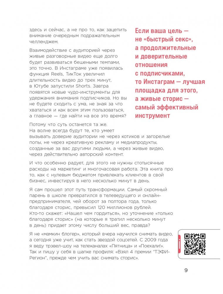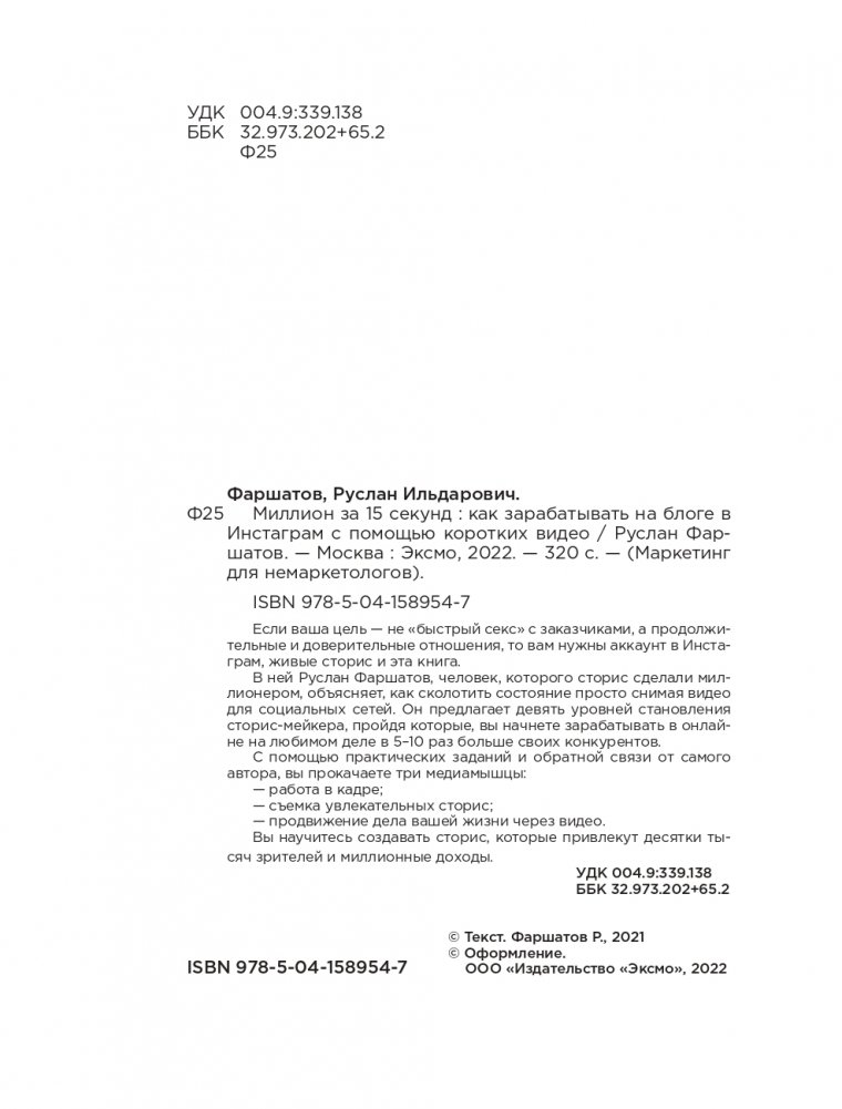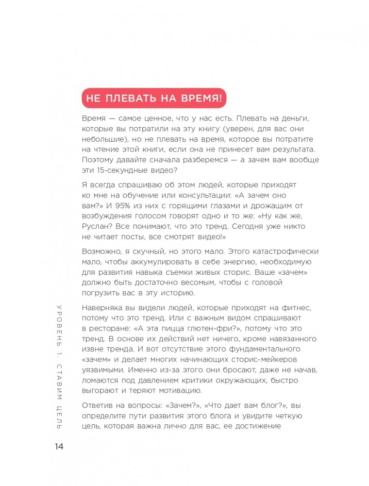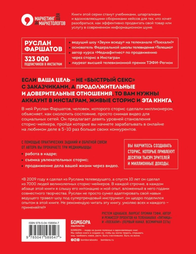 Если ваша цель — не "быстрый секс" с заказчиками, а продолжительные и доверительные отношения, то вам нужны аккаунт в Инстаграм, живые сторис и эта книга. В ней Руслан Фаршатов, человек, которого сторис сделали миллионером, объясняет, как сколотить состояние просто снимая видео для социальных сетей. Он предлагает девять уровней становления сторис-мейкера, пройдя которые, вы начнете зарабатывать в онлайне на любимом деле в 5–10 раз больше своих конкурентов. С помощью практических заданий и обратной связи от самого автора, вы прокачаете три медиамышцы: - работа в кадре; - съемка увлекательных сторис; - продвижение дела вашей жизни через видео. Вы научитесь создавать сторис, которые привлекут десятки тысяч зрителей и миллионные доходы.