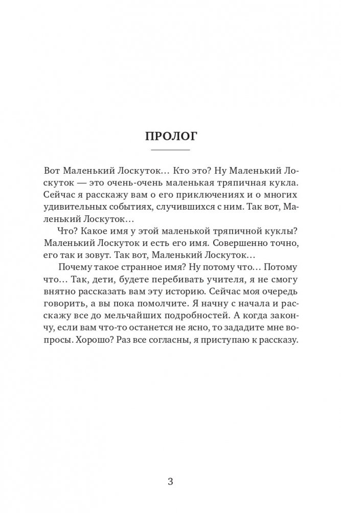 Как вы думаете, нравятся ли игрушкам их хозяева? Задумывались ли вы когда-нибудь, кто больше по душе кукле, медвежонку и обезьянке — заботливая девочка или непоседливый мальчик? А может быть, игрушки мечтают о приключениях, но мы об этом даже не подозреваем? Эта история о том, как крошечная тряпичная кукла по имени Маленький Лоскуток решила сбежать от хозяйки, отправившись в далекое путешествие, чтобы доказать всем свою смелость. В своем приключении Лоскуток познакомится с Электромотором, Большим Черпаком, Пшеницей и другими вещами и людьми. Он прокатится на настоящем поезде, полетает на «самолете», победит злых крыс и встретит настоящих друзей.