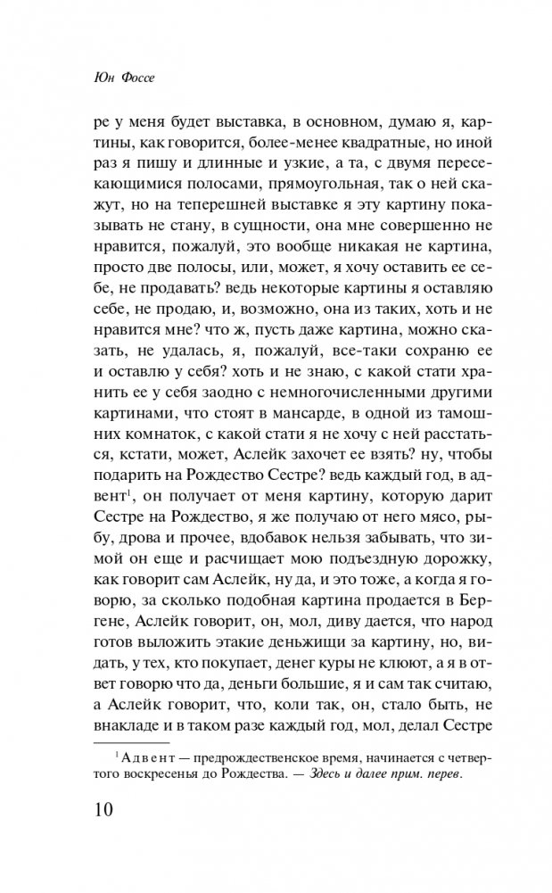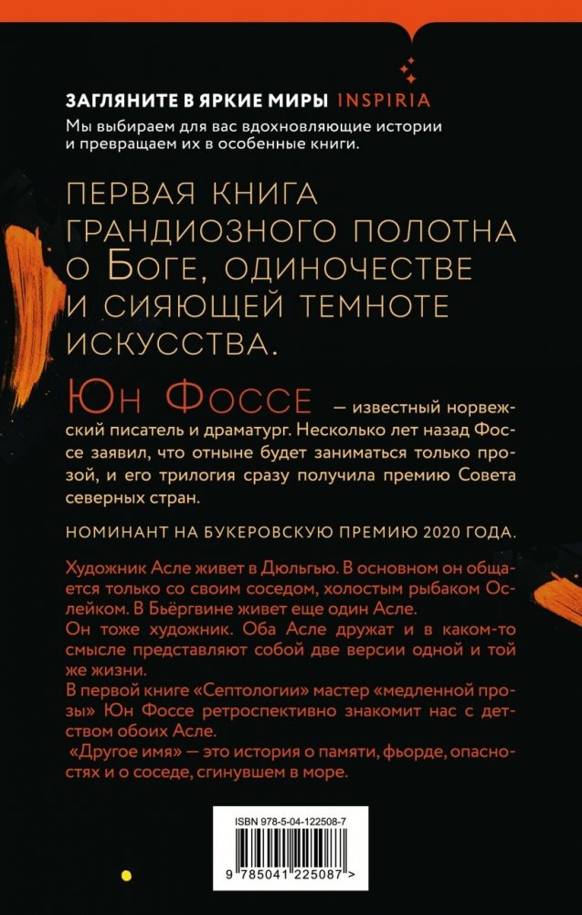 Художник Асле живет в Дюльгью. В основном он общается только со своим соседом, холостым рыбаком Ослейком. В Бьёргвине живет еще один Асле. Он тоже художник. Оба Асле дружат и в каком-то смысле представляют собой две версии одной и той же жизни. В первой книге "Септологии" мастер "медленной прозы" Юн Фоссе ретроспективно знакомит нас с детством обоих Асле. "Другое имя" — это история о памяти, фьорде, опасностях и о соседе, сгинувшем в море.