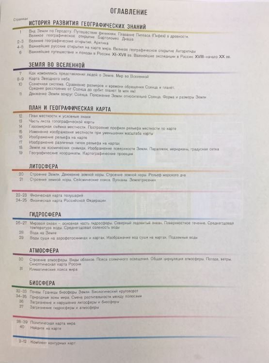 Прежде всего ознакомьтесь с оглавлением. В состав атласа входят географические карты, планы местности, схемы, космические снимки, фотографии, рисунки. В справочном разделе помещены сведения о длинах важнейших рек, площадях крупнейших озёр и островов, высочайших горных вершинах, наибольших глубинах океанов.