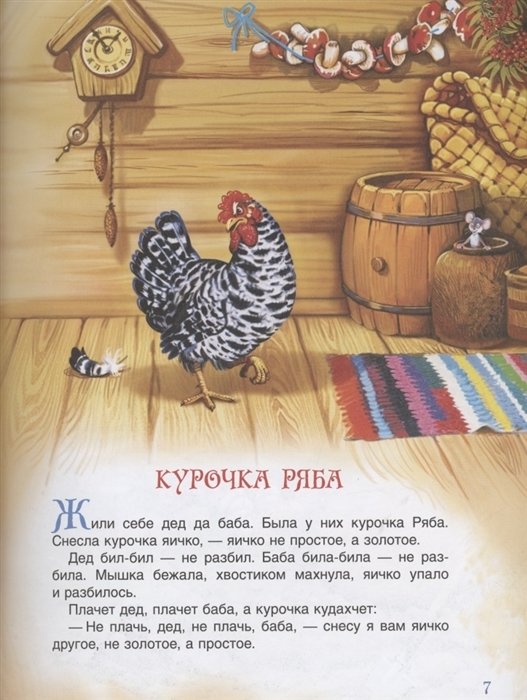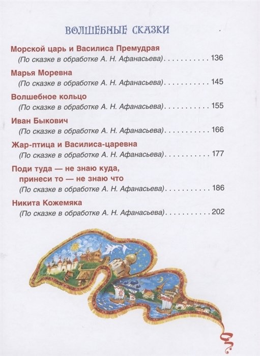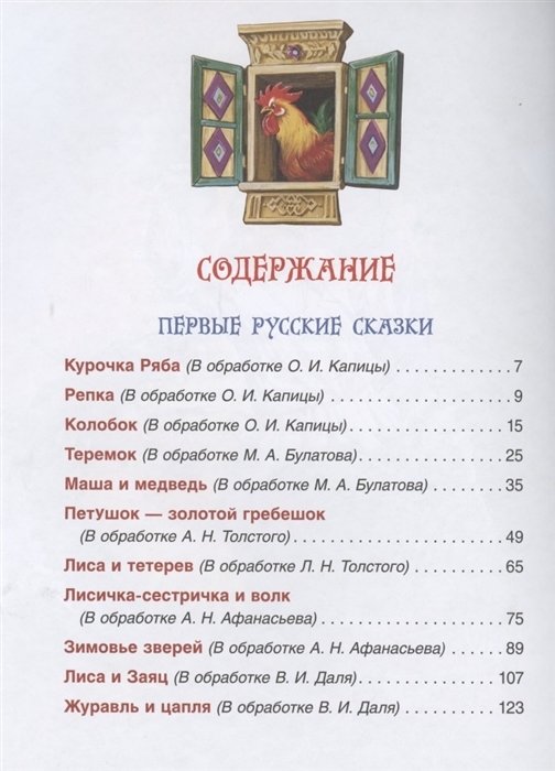 В сборник вошли известные русские сказки от «Теремка» и «Колобка» до «Марьи Моревны» и «Волшебного кольца».