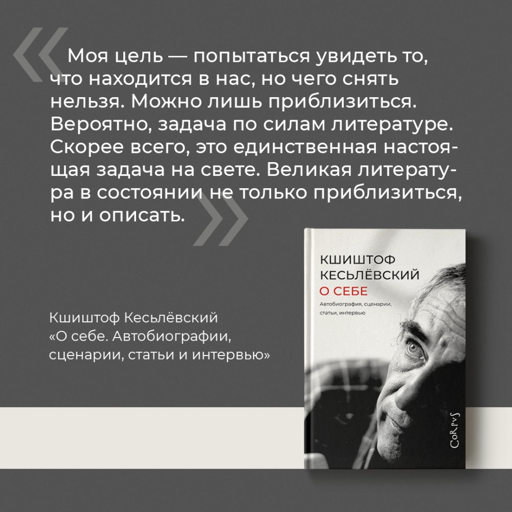 В книге выдающегося польского режиссера и драматурга Кшиштофа Кесьлёвского (1941–1996), собраны сценарии его прославленных фильмов — «Кинолюбитель», «Случай», «Без конца», «Декалог», «Двойная жизнь Вероники», «Три цвета: синий, белый, красный», а также статьи Кесьлёвского и интервью разных лет. Открывается книга автобиографией «О себе» — рассказом о жизни, работе, семье и коллегах, временах и странах.
