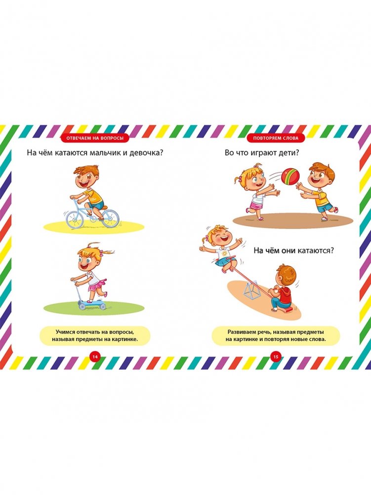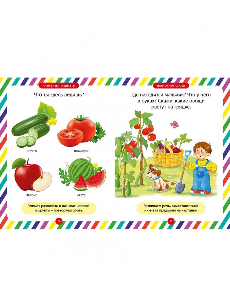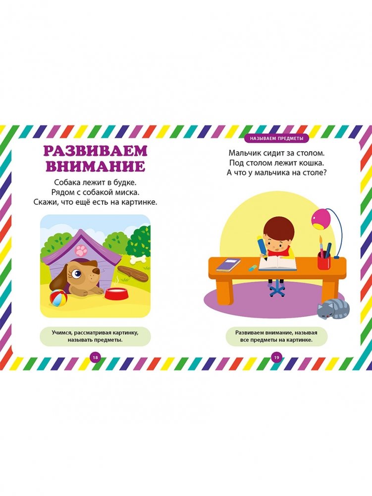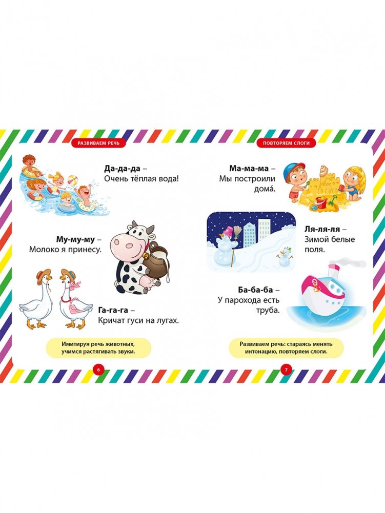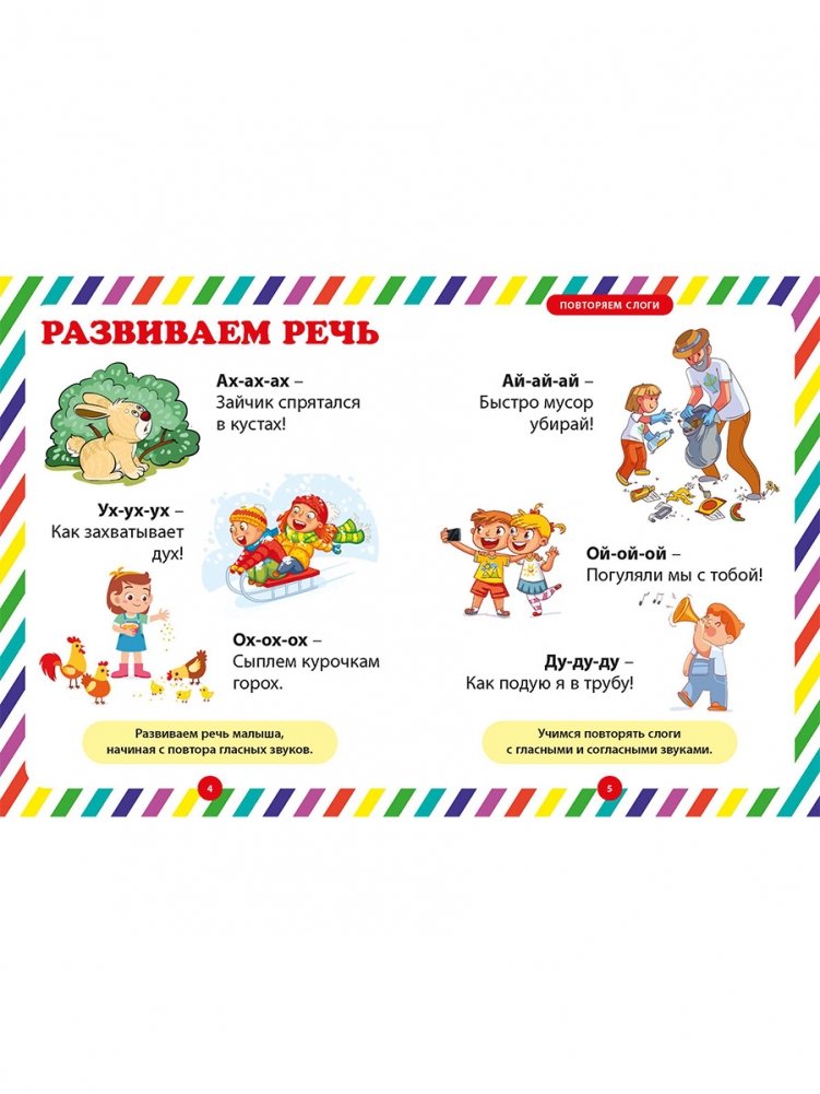 Давайте вместе поможем его развитию, начиная с несложных заданий для ребёнка. Рассматривая яркие картинки на страницах этой книжки, он сможет повторять за вами слоги, затем слова и фразы, постепенно научится различать цвета и формы, противоположности, считать от 1 до 5 и многое другое. Занимаясь с малышом по нашей книге, вы научите его вниманию, простой логике, расширите его кругозор. Пусть эта книга станет для вас добрым помощником в занятиях с вашим ребёнком!