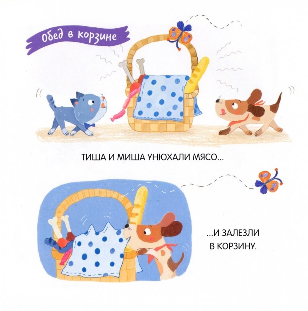 Весёлые истории про котёнка Тишу и щенка Мишу вызывают яркие эмоции у малышей: удивление, смех, радость, интерес. Так и хочется обсудить со взрослым каждую картинку, а потом самостоятельно рассказать о приключениях забавных героев.