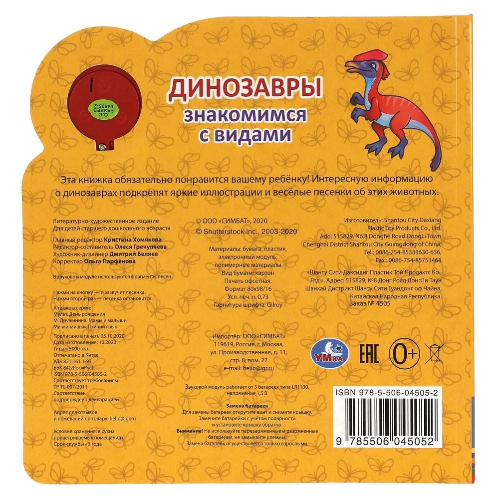 Ребёнок с удовольствием будет листать плотные картонные страницы, рассматривать красочные картинки, читать интересные факты о разнообразных динозаврах, а также нажимать на кнопку и слушать весёлые песенки. Для привлечения большего внимания малыша к книге и развития его сенсорики на обложке имеется элемент из приятного на ощупь силикона. Благодаря компактному формату книгу удобно брать с собой в дорогу.