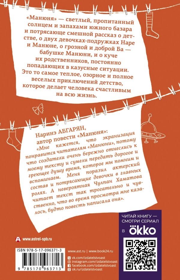 «Манюня» — светлый, пропитанный солнцем и запахами южного базара и потрясающе смешной рассказ о детстве, о двух девочках-подружках Наре и Манюне, о грозной и доброй Ба — бабушке Манюни, и о куче их родственников, постоянно попадающих в казусные ситуации. Это то самое теплое, озорное и полное веселых приключений детство, которое делает человека счастливым на всю жизнь.
