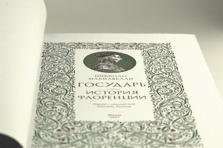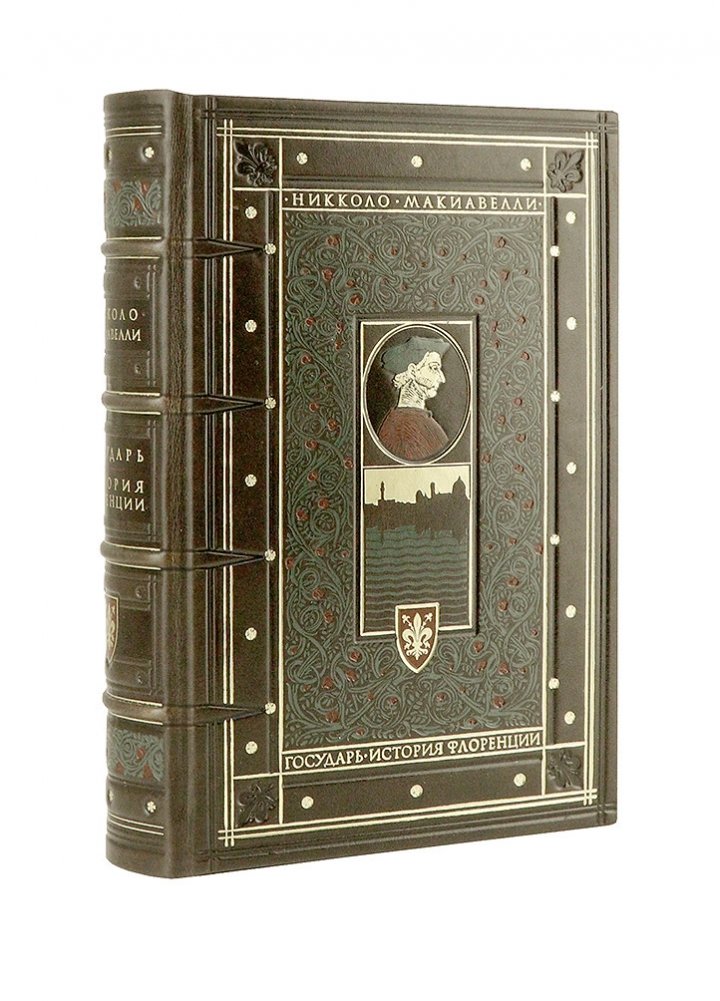 Коллекционное издание, тираж составляет всего 10 экземпляров. Объемный тяжелый том отпечатан на плотной белой бумаге, изящный набор украшен цветными растительными орнаментами. Переплет ручной работы изготовлен по старинным технологиям из плотной телячьей кожи натурального дубления, покрытой натуральным воском. Переплет украшен растительным цветным орнаментом, а рельефное и золотое тиснение полностью соответствует историческим образцам XVI века. На передней сторонке гравированное изображение Н. Макиавелли, флорентийский пейзаж и герб города Флоренции. Обрезы торшонированы. Форзацы из дизайнерской фактурной бумаги. Три разноцветных шелковых ляссе. Книга в кожаном переплете ручной работы послужит нескольким поколениям читателей.