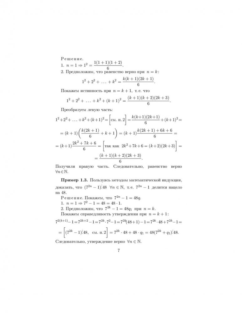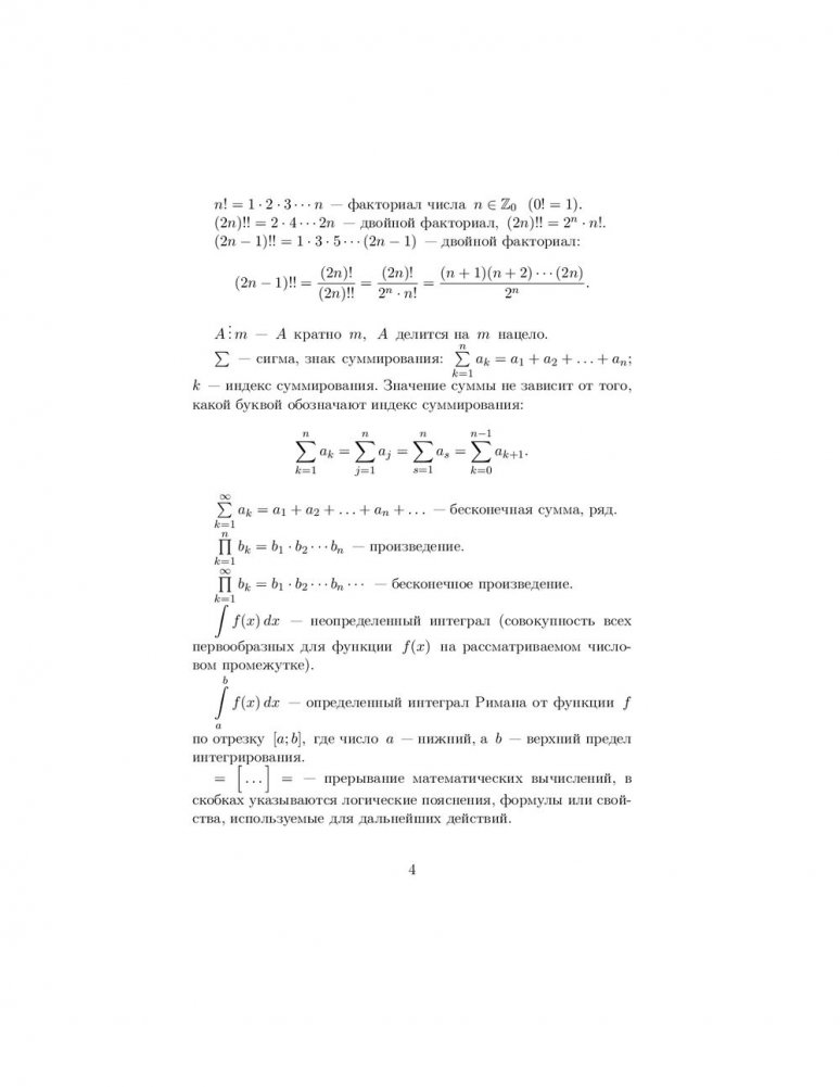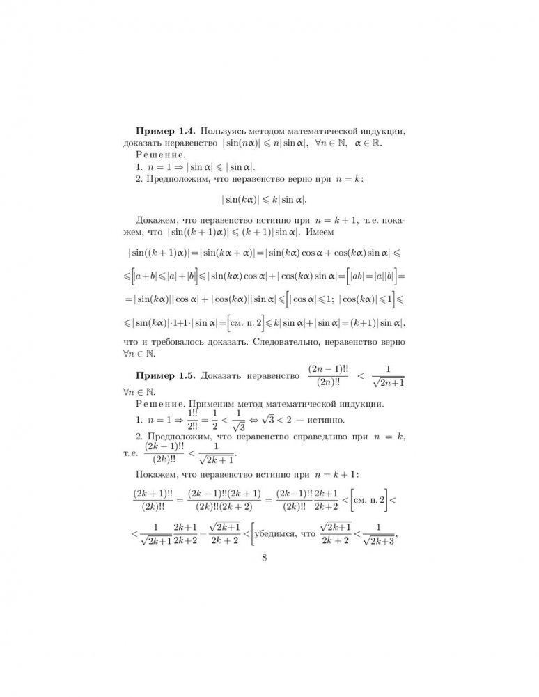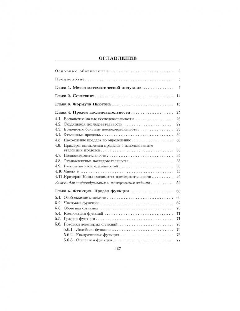 Содержатся основные теоретические сведения о методе математической индукции, формуле бинома Ньютона, числовых последовательностях, пределе, непрерывности и дифференцируемости функций, исследовании функций с помощью производных и построении их графиков, а также о неопределенном и определенном интегралах. Предложены основные приемы решения типовых задач по этим темам. Изложение материала иллюстрируется подробно разобранными примерами. Представлено большое количество упражнений для самоконтроля, снабженных ответами. Приведены задачи для индивидуальных и контрольных заданий.