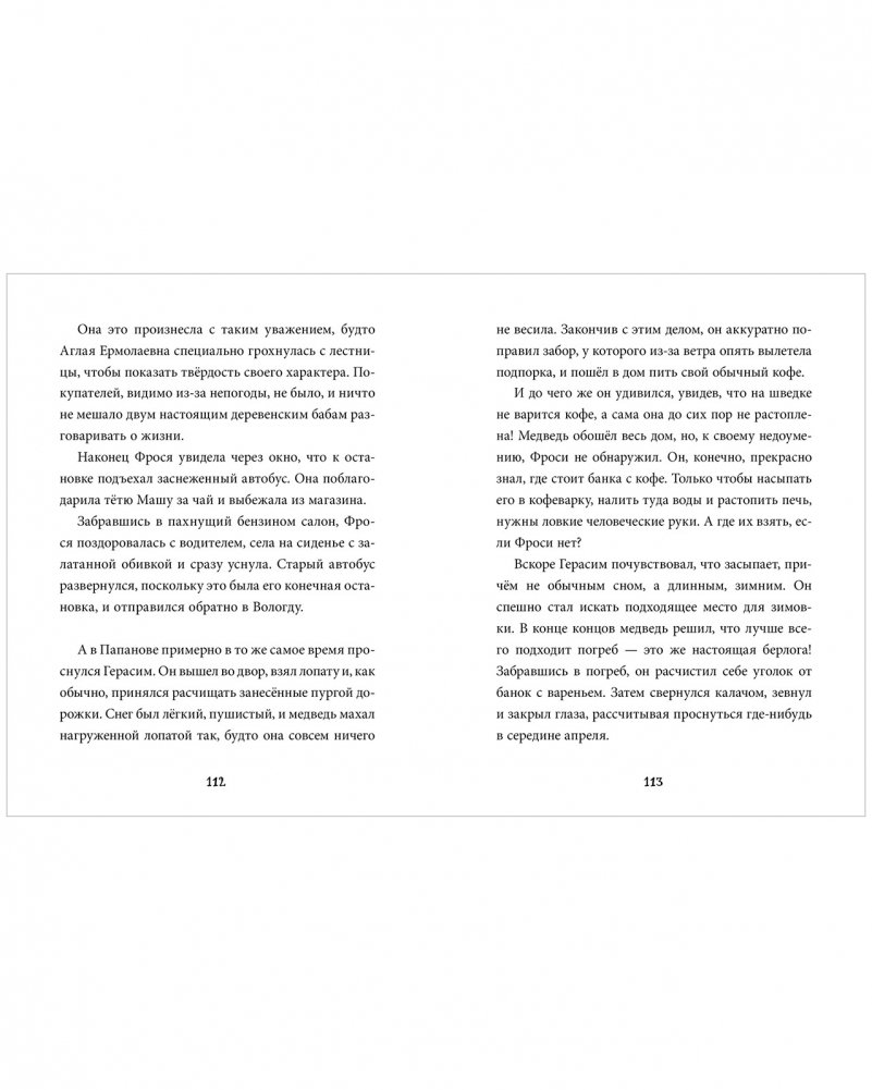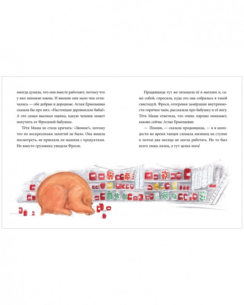 Фрося и её бабушка Аглая Ермолаевна живут в памятнике. Не в статуе, конечно. В памятнике зодчества! Живёт девочка в деревне настоящей, считает себя "деревенской бабой Ефросиньей", умеет копать, поливать, давать отпор пьянице Никанору… И заботы у неё подчас не такие, как у обычной девчонки не о новых нарядах и компьютерных играх, а о том, как добраться до города в снегопад, как управиться одной с хозяйством, если бабушка в больнице (помощник у неё был только один - медведь Герасим). А тут ещё и дом украли!
