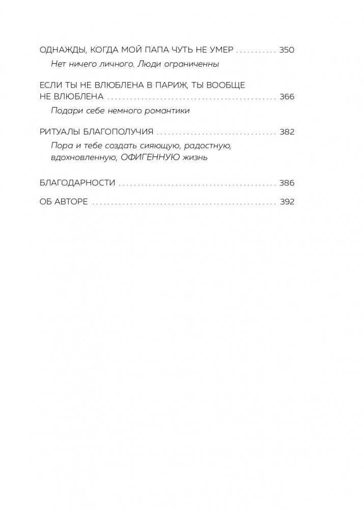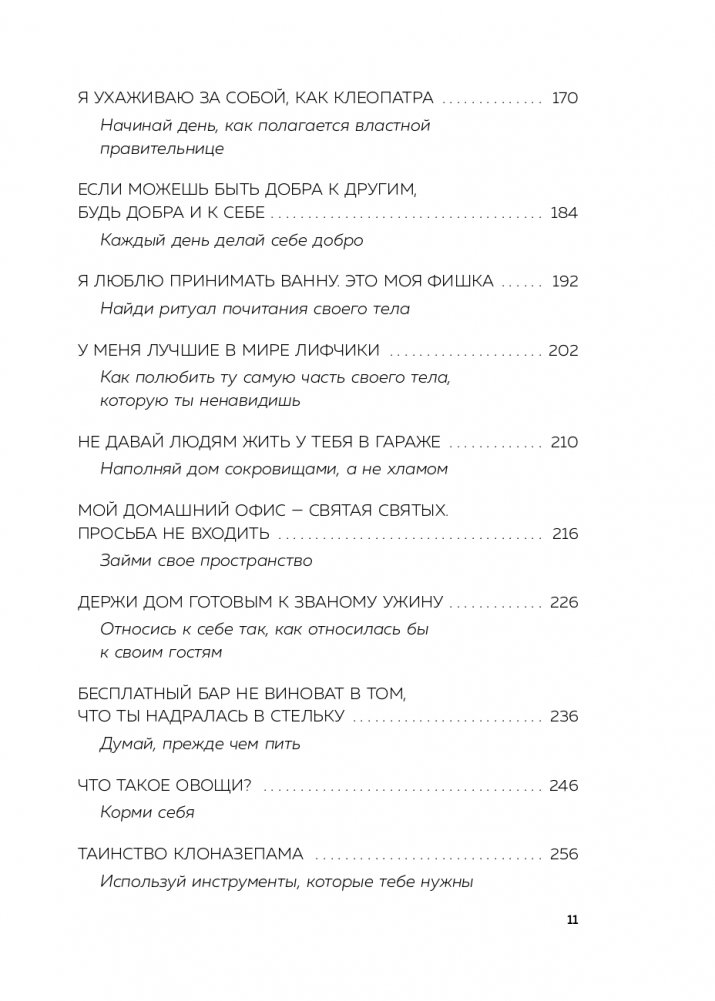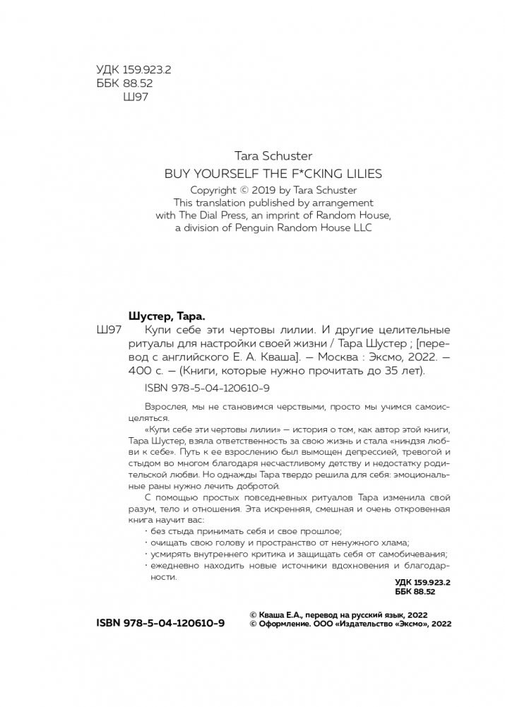 Взрослея, мы не становимся черствыми, просто мы учимся самоисцеляться. Эта книга для тех, чья душа покрыта корочкой льда. Для тех, кто прячется от настоящего себя в бессмысленной суете и поверхностных отношениях. Для тех, кто живет с закрытыми глазами, одинаково опасаясь смотреть как в будущее, так и в прошлое. Эта книга — дорожка из хлебных крошек, которые ведут сквозь темный лес к теплу и свету. Написанная Тарой Шустер, талантливым сценаристом и телеведущей, она учит создавать внешние опоры из маленьких целительных ритуалов, вроде спонтанной покупки любимых цветов. Учит принимать свое тело, любить себя, держать плечи расправленными, а сердце — открытым. Очень практичная и обволакивающе теплая, эта книга помогает преодолеть душевные травмы и начать жить в полную силу.
