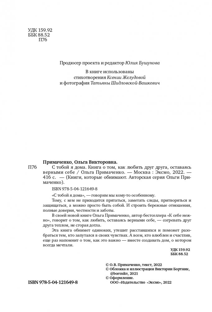 "С тобой я дома", — говорим мы кому-то особенному. Тому, с кем не приходится прятаться, заметать следы, притворяться и защищаться, — а можно просто быть собой. И строить бережные отношения, полные доверия, честности и заботы. В своей новой книге Ольга Примаченко, автор бестселлера "К себе нежно", говорит о том, как любить, оставаясь верными себе, — согревать друг друга теплом, не сгорая дотла. Эта книга обнимет одиноких, утешит расставшихся и поможет разобраться тем, кто запутался в своих чувствах. А всем, кто влюблен и счастлив, еще раз напомнит о том, как это важно — вместе создавать дом, о котором всегда мечтали.