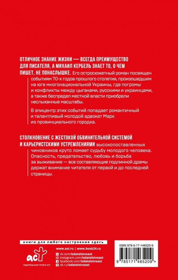 Отличное знание жизни — всегда преимущество для писателя, а Михаил Кербель знает то, о чем пишет, не понаслышке. Его остросюжетный роман посвящен событиям 70-х годов прошлого столетия, произошедшим на юге многонациональной Украины, где погромы и конфликты между цыганами, русскими и украинцами, а также беспредел местной власти приобрели неслыханные масштабы. В эпицентр этих событий попадает романтичный и талантливый молодой адвокат Марк из провинциального городка. Столкновение с жестокой обвинительной системой и карьеристскими устремлениями высокопоставленных чиновников круто ломает судьбу молодого человека. Опасность, предательство, любовь и борьба за выживание — все составляющие подлинной драмы держат внимание читателя от первой и до последней страницы.