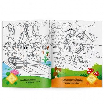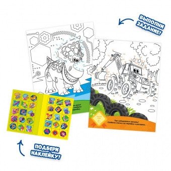 Раскраска с наклейками по точкам, буквам и цветам. Турбозавры, вперед!