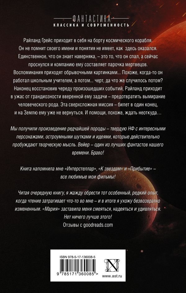 Наконец восстановив череду произошедших событий, Райланд приходит в ужас от грандиозности вверенной ему задачи – предотвратить вымирание человеческого рода. Эта сверхсложная миссия – билет в один конец, и на Землю ему уже не вернуться. И помощи, похоже, ждать неоткуда…