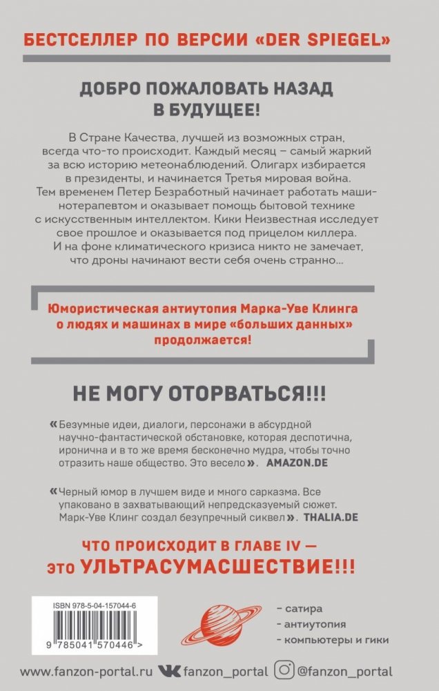 Двадцать первый век. Век разума, социальной и экономической справедливости. Век качественной жизни. Век Страны Качества. Страны, построенной на "больших данных", искусственных интеллектах и всесильных алгоритмах, которым подчиняются все государственные и коммерческие службы. Но алгоритмы начинают работать непредсказуемо, дроны ломаются, климат меняется, а к власти рвутся силы, не заинтересованные в общественном благосостоянии. Что делать нашим героям — Петеру Безработному, Кики Неизвестной, Каллиопе 7.3 и Айше Доктору?