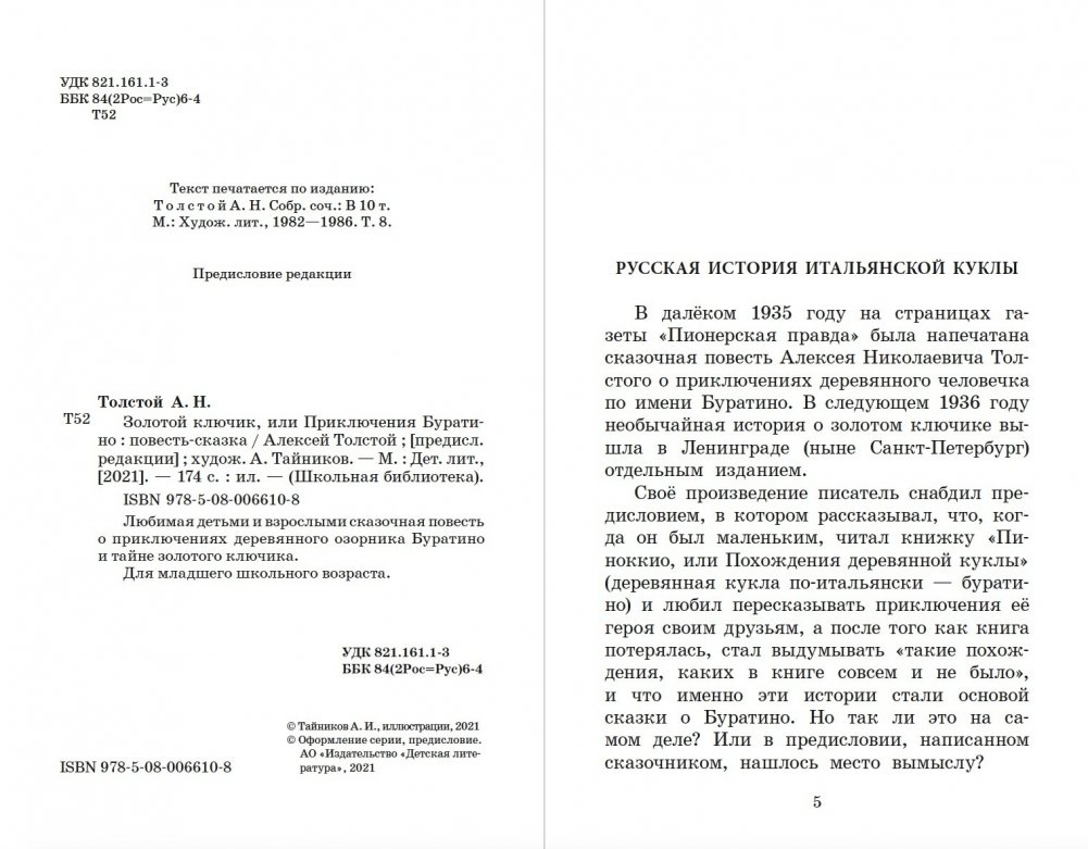 Любимая детьми и взрослыми сказочная повесть о приключениях деревянного озорника Буратино и тайне золотого ключика. Книга с предисловием об истории создания романа-сказки, его отличиях от книги К. Коллоди.