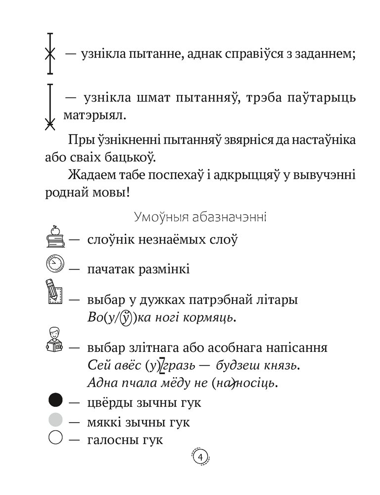 Матэрыял можа выкарыстоўвацца ў школе на этапах актуалізацыі, замацавання і паўтарэння вучэбнага матэрыялу, а таксама дома для ўзнаўлення ведаў. Сшытак дапаможа сфарміраваць арфаграфічную пільнасць, засвоіць правілы з розных раздзелаў мовазнаўства, якія вывучаюцца ў пачатковай школе.