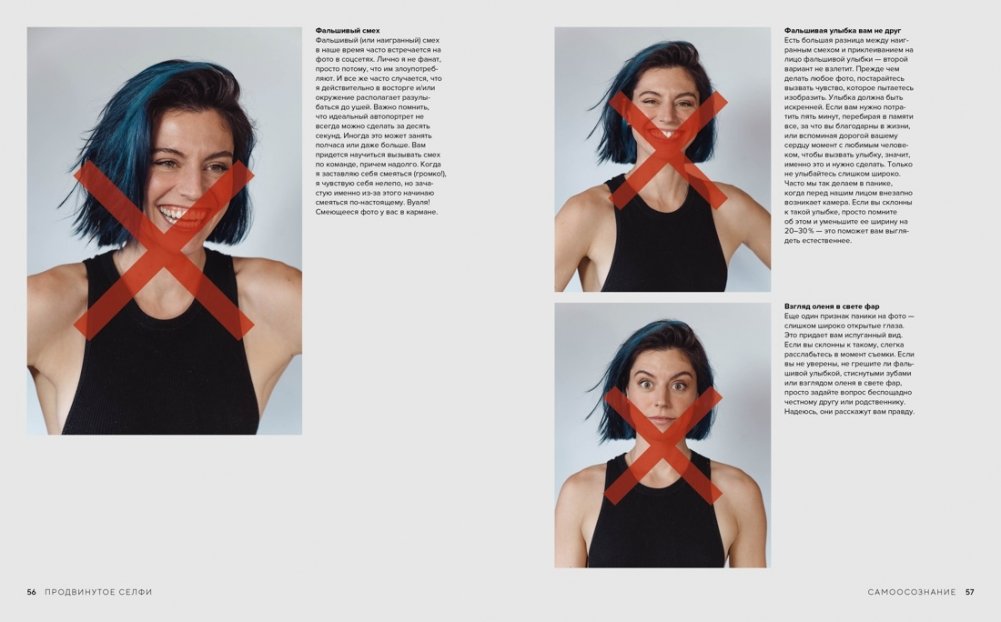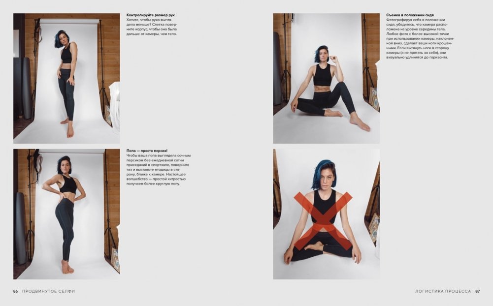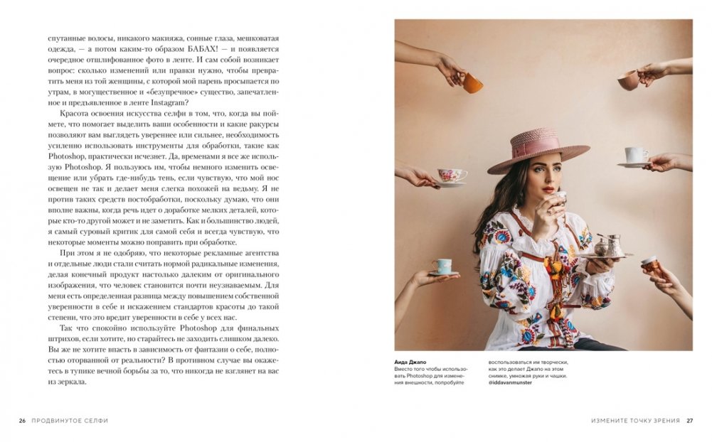 «За относительно недолгий срок я поняла, как снимать себя с помощью одной камеры и пары простых инструментов так, чтобы снимки были достойны журнала высокой моды. (Попрошу заметить — у меня был ровно ноль опыта в качестве модели, да и опыт по ту сторону объектива также был весьма невелик.) В итоге я назвала этот метод фотографирования “Продвинутым селфи”... Моя настойчивость привела к тому, что миллионы людей посмотрели мои тематические видео, меня опубликовали в СМИ по всему миру, а теперь вы читаете эту книгу, где я передаю по цепочке мои художественные навыки. Нужно всего лишь вникнуть в основы, приобрести немного уверенности — и для вас откроется дорога исследований и бесконечного творчества». (Сорелл Амор)