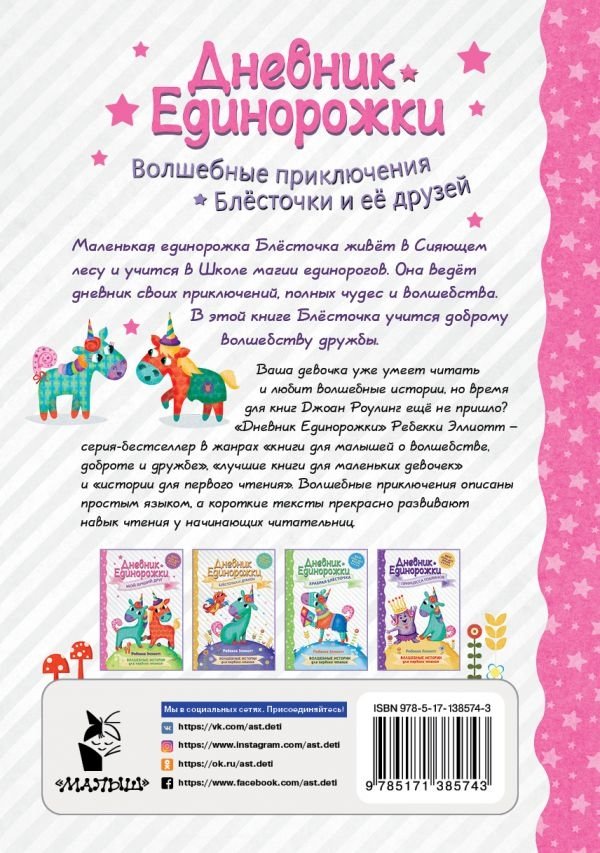 Ваша девочка уже умеет читать и любит волшебные истории, но время для книг Джоан Роулинг ещё не пришло? "Дневник Единорожки" – идеальная серия книг для первого чтения для маленьких любительниц чудес и волшебства. Маленькая единорожка Блёсточка живёт в Сияющем лесу и учится в Школе магии единорогов. Она ведёт дневничок, в котором рассказывает о своих удивительных друзьях и ЗАБЛЕСТАТЕЛЬНЫХ приключениях! История написана простым языком и научит юных читательниц дружбе, взаимопомощи и доброте.