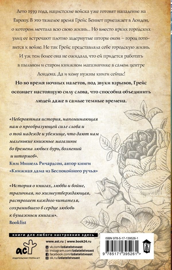 Лето 1939 года, нацистские войска уже готовят нападение на Европу. В это тяжелое время Грейс Беннет приезжает в Лондон, о котором мечтала всю свою жизнь… Но вместо ярких городских улиц ее встречают плотно задернутые шторы окон – город гото¬вится к войне. Не так Грейс представляла себе городскую жизнь. И уж тем более она не ожидала, что ей придется работать в пыльном и старом книжном магазинчике в самом центре Лондона. Да и кому нужны книги сейчас! Но во время ночных налетов, под звуки взрывов, Грейс осознает настоящую силу слова, что способно объединить людей даже в самые темные времена.